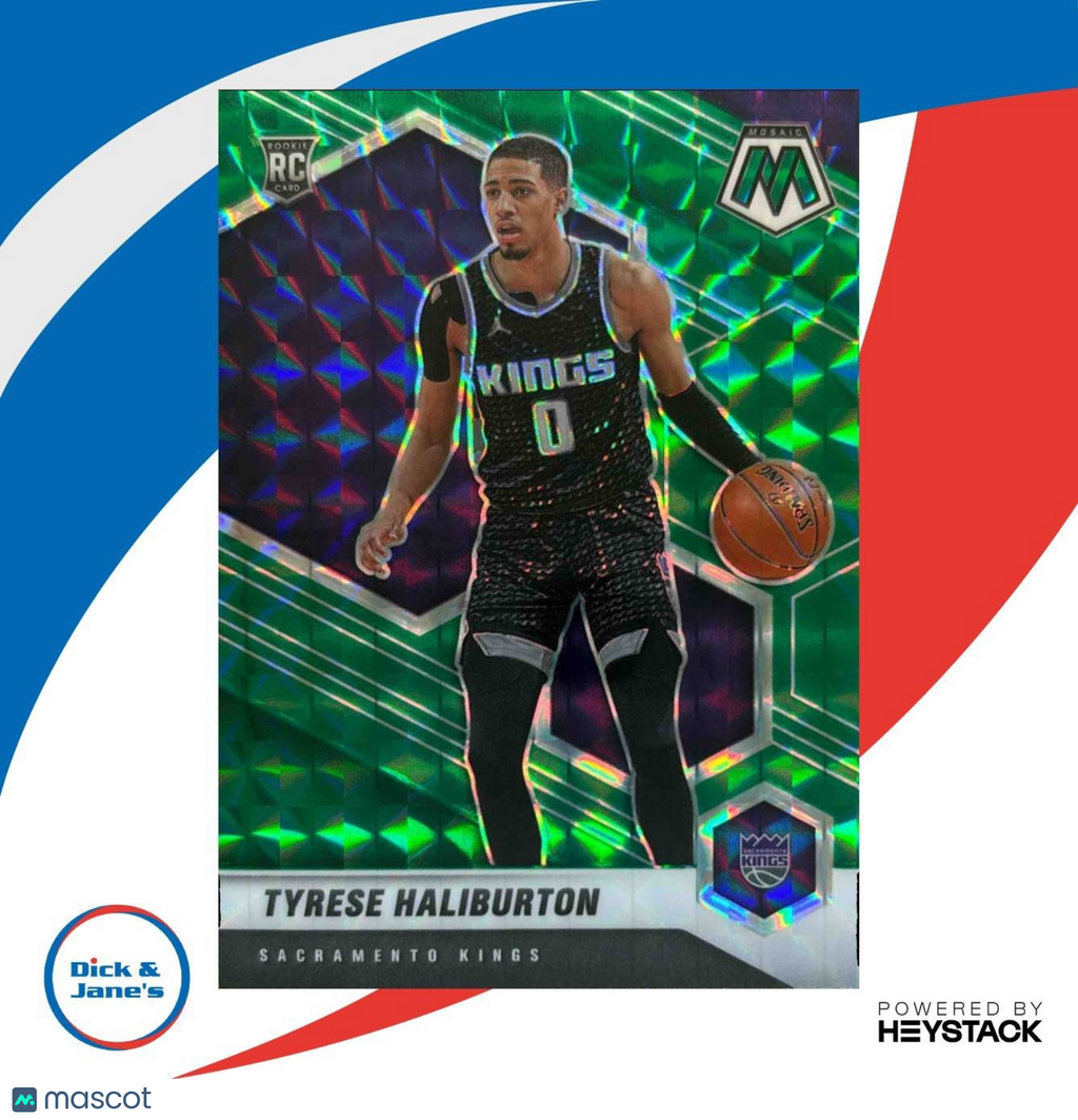 The 2020-21 Panini Mosaic Tyrese Haliburton Reactive Green #204 RC Sacramento Kings card is a highly collectible NBA rookie card featuring the talented young player. This rare card is sure to be a valuable addition to any sports card collection. Don't miss your chance to own a piece of basketball history! Listed With Mascot.