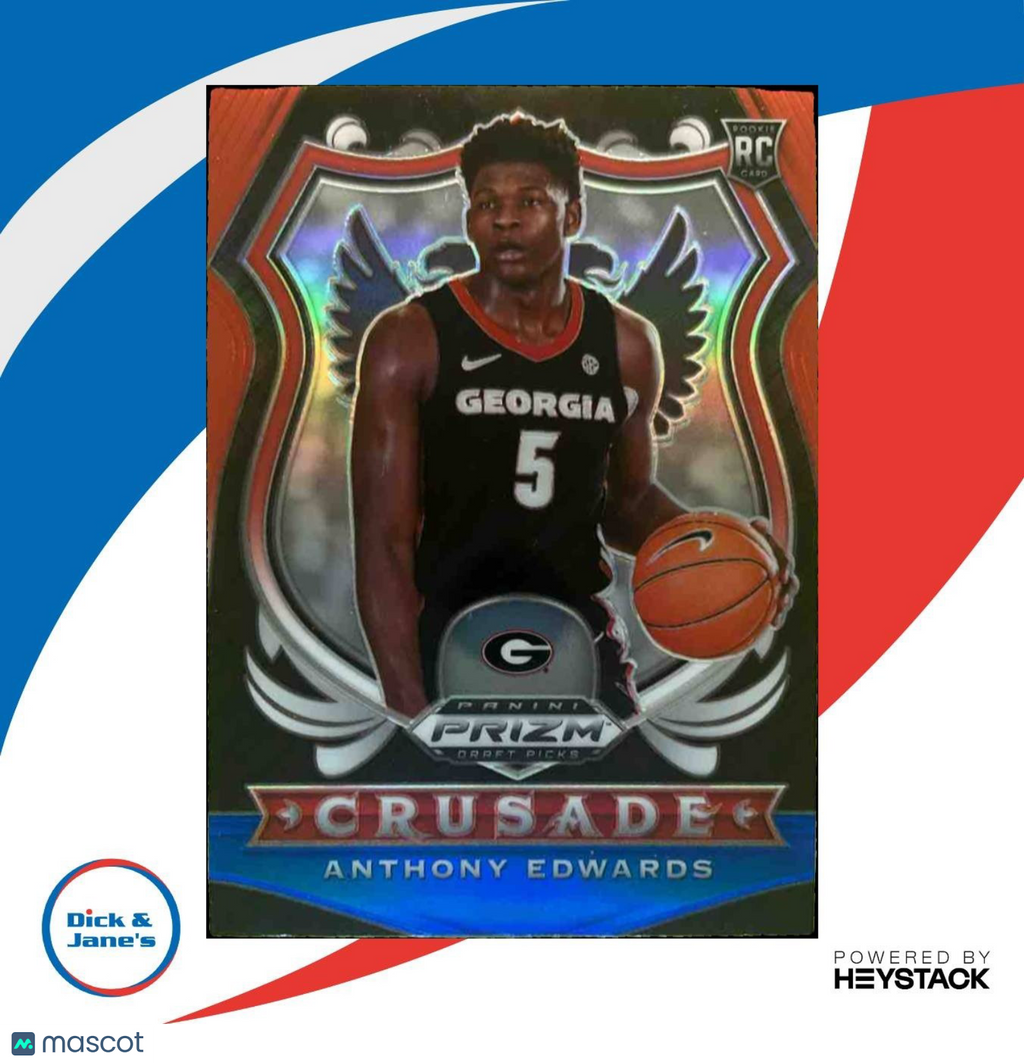 Own a piece of basketball history with this 2020-21 Panini Prizm Draft Anthony Edwards Red White and Blue #81 RC Bulldogs card. This NCAAF Crusade RC card features the standout player in his college uniform. A must-have for any basketball card collector or Anthony Edwards fan. Get yours today! Listed With Mascot.