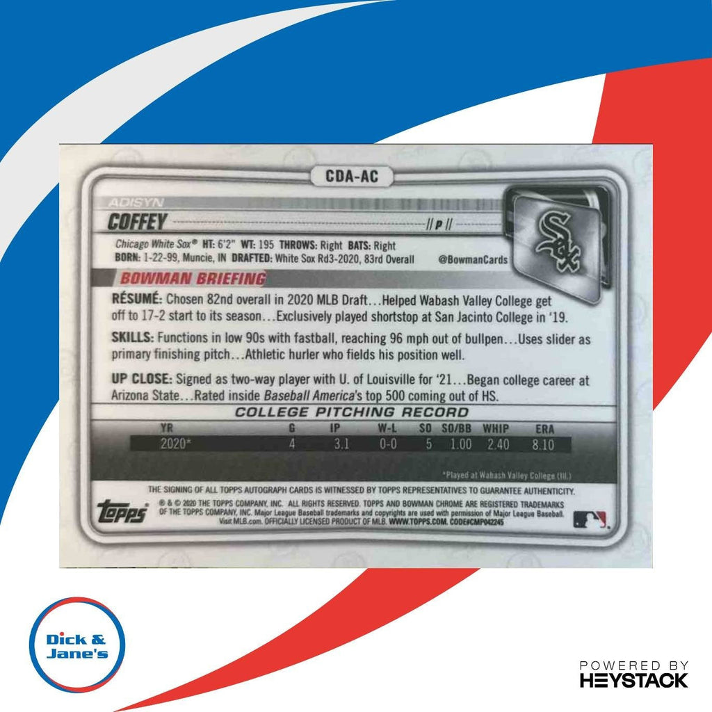 Get your hands on this rare 2020 Bowman Draft Adisyn Coffey Chrome Pick Auto Green Refractor /99 White Sox trading card! This MLB card features an authentic player autograph and is limited to only 99 copies. Don't miss out on adding this valuable collectible to your sports trading card collection. Order now! Listed With Mascot.