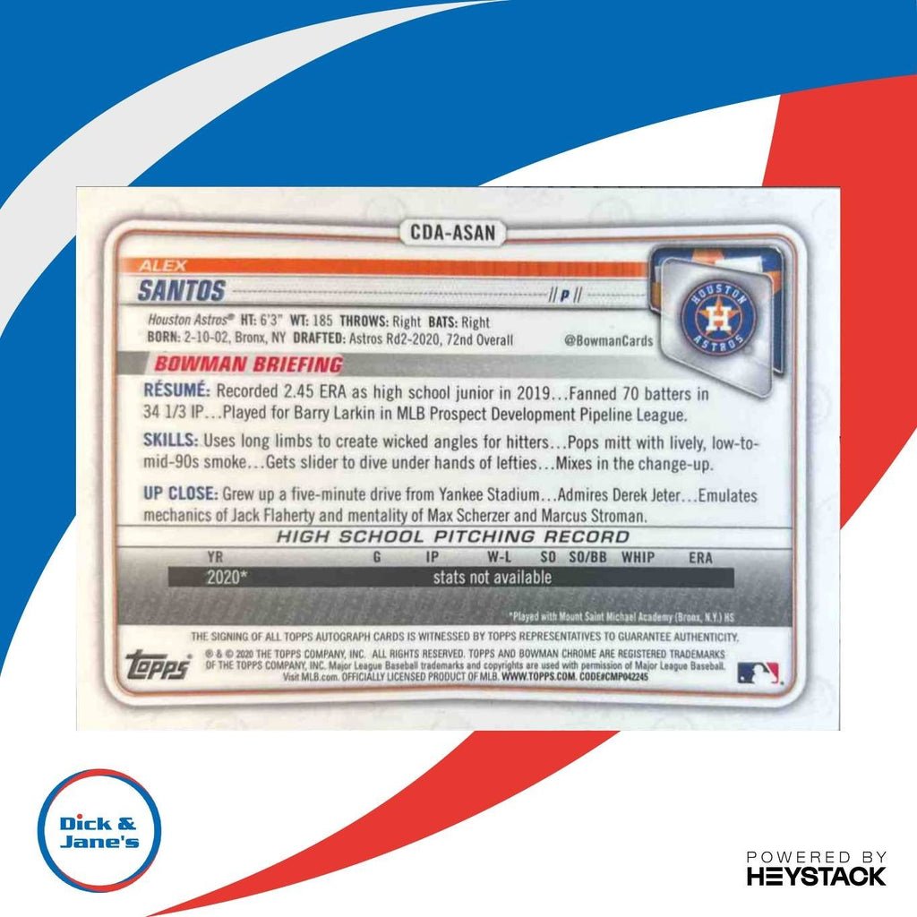 This 2020 Bowman Draft Alex Santos Chrome Pick Auto trading card features an authentic autograph from the Houston Astros pitcher. A must-have for baseball card collectors, this card showcases Santos' talent and potential. Perfect for fans of the MLB and Houston Astros. Listed With Mascot.