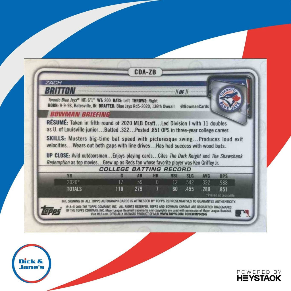 This 2020 Bowman Draft Zach Britton Chrome Pick Auto trading card features the Toronto Blue Jays player's signature, making it a rare and valuable collectible for MLB fans. Add this must-have card to your collection today! Listed With Mascot.