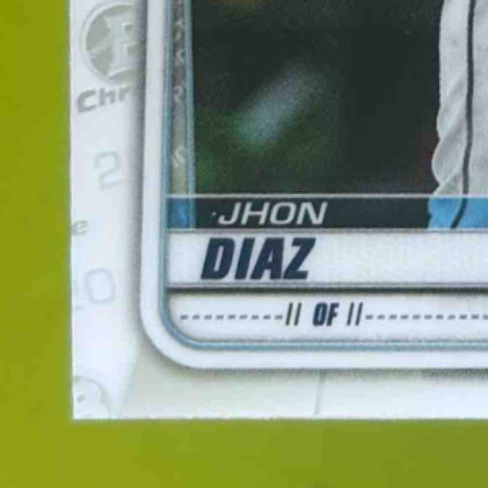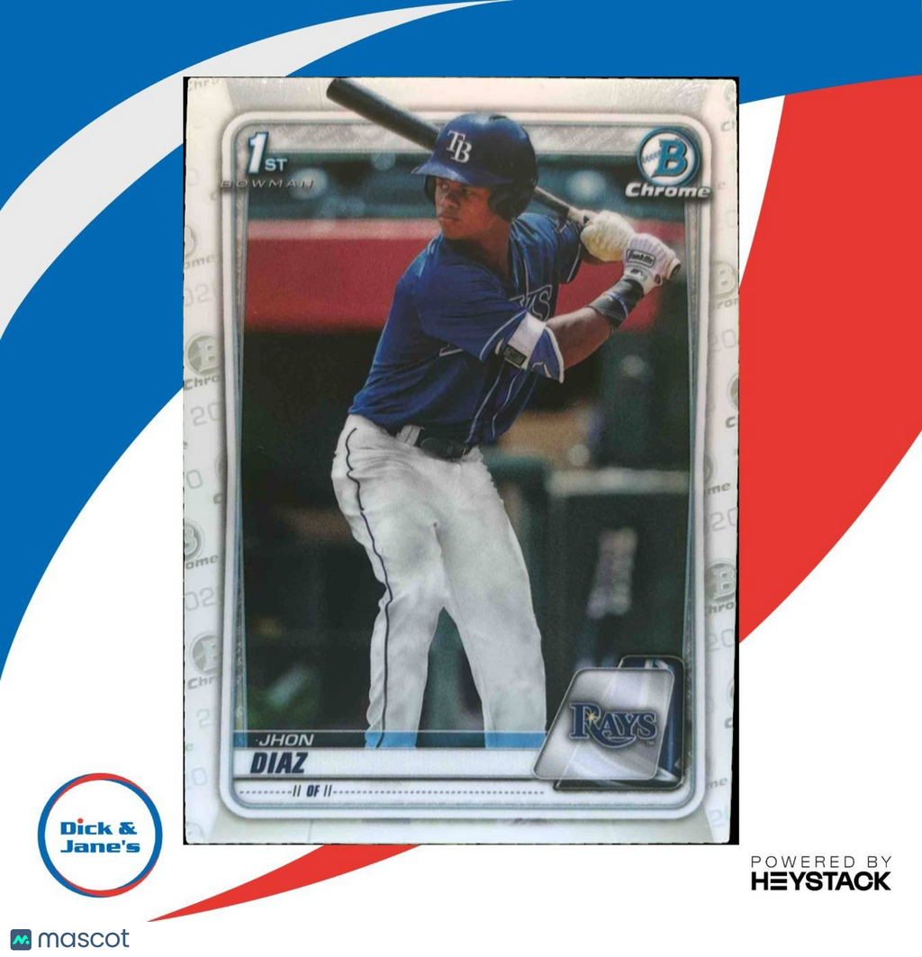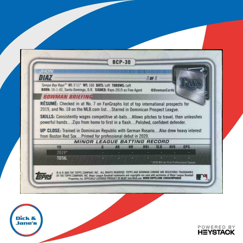 The 2020 Bowman Jhon Diaz Chrome Prospects #BCP-30 card features rising star Jhon Diaz of the Tampa Bay Rays. This MLB card captures Diaz in all his potential glory, making it a must-have for any baseball card collector or fan of the Rays. Don't miss your chance to own a piece of baseball history! Listed With Mascot.