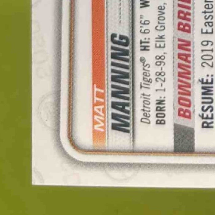 This 2020 Bowman Matt Manning Prospect Auto #PA-MM Detroit Tigers MLB trading card features an authentic autograph from the player himself. A must-have for any Detroit Tigers fan or baseball card collector. Don't miss out on adding this rare and valuable card to your collection! Listed With Mascot.