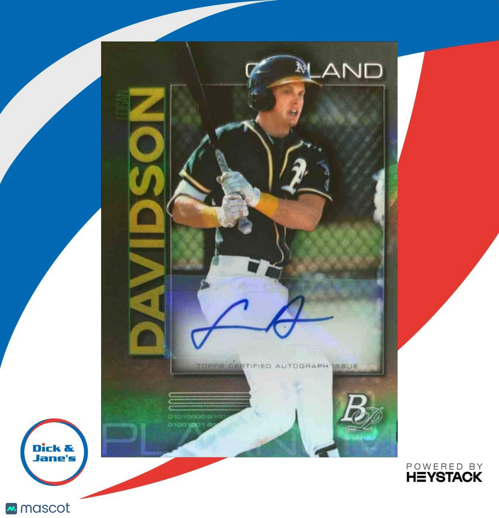Elevate your sports card collection with this 2020 Bowman Platinum Logan Davidson Top Prospect Auto #TOP-37 Oakland Athletics MLB card. This autographed gem showcases the rising star's talent and potential, making it a must-have for any dedicated baseball fan or trading card enthusiast. Secure your piece of history today! Listed With Mascot.