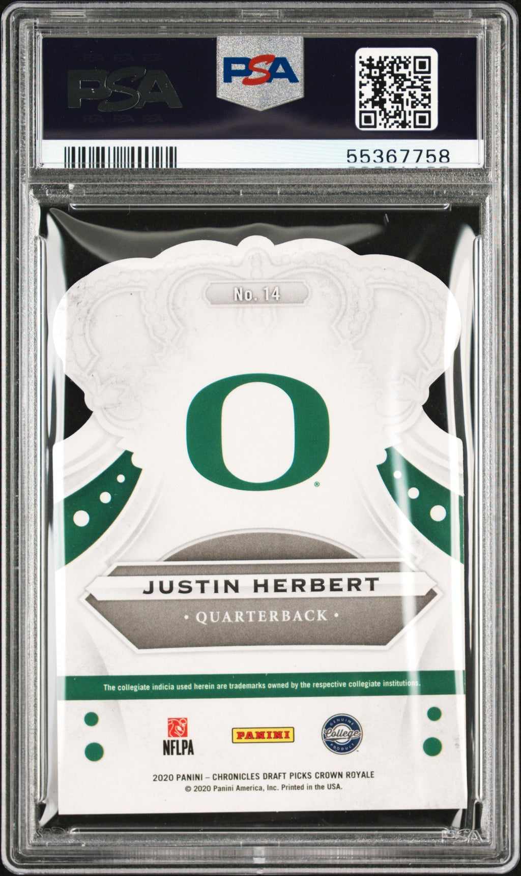 You are purchasing the following: 2020 Panini Chronicles Draft Picks Crown Royale Justin Herbert Red Rookie #14 PSA 10 . You will receive the exact item in the photographs. Note: Please do not connact us and asking the following: 1. What is the lowest you would take? Just make an offer. If the offer is automatically declined, you have your answer. 2. What the best you can do? See above. Not repling to an email is a reply. 3. Any room on this? See above. Not repling to an offer is a reply. 4. We ONLY do one counter offer, so please make your best offer the first time! Note: If the price off, in your option, please send your resaoning and an offer. We will review it. Note: We manage nearly 10 millon cards regularly and will adjust prices as errors are noticed or pointed out! Listed With Mascot.