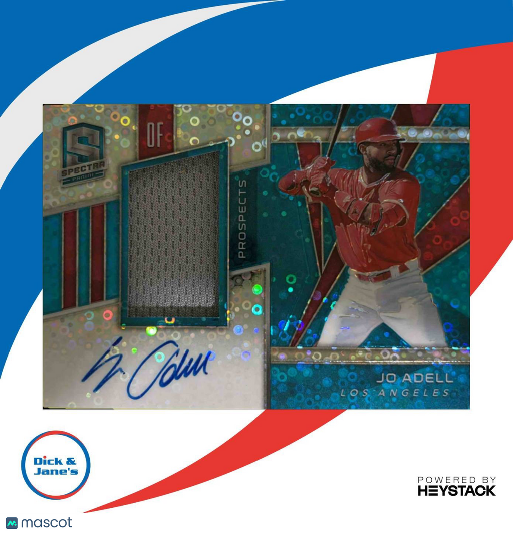 Own a piece of baseball history with this rare 2020 Chronicles Jo Adell Spectra Prospect Jersey Auto Neon Blue trading card featuring an autograph and memorabilia from the up-and-coming LA Angels player. Limited edition /99. Perfect addition to any sports card collection! Listed With Mascot.