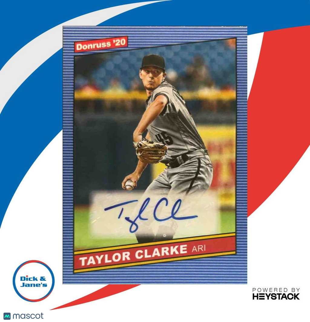Add this rare and unique 2020 Donruss Taylor Clarke Retro 1986 Signatures card to your collection. This MLB trading card features an autographed signature from Taylor Clarke of the Diamondbacks. A must-have for any dedicated sports card collector. Listed With Mascot.