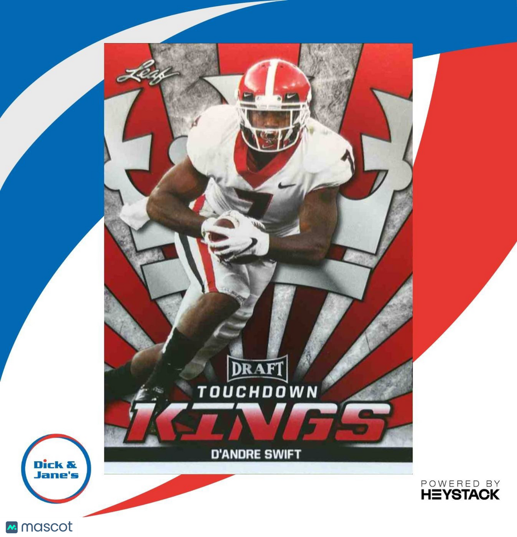 Get your hands on this highly collectible 2020 Leaf Draft D'Andre Swift Red #78 RC Georgia Bulldogs trading card! This NCAAF rookie card features the talented running back in his college colors, making it a must-have for any sports trading card enthusiast. Don't miss out on adding this rare find to your collection! Listed With Mascot.