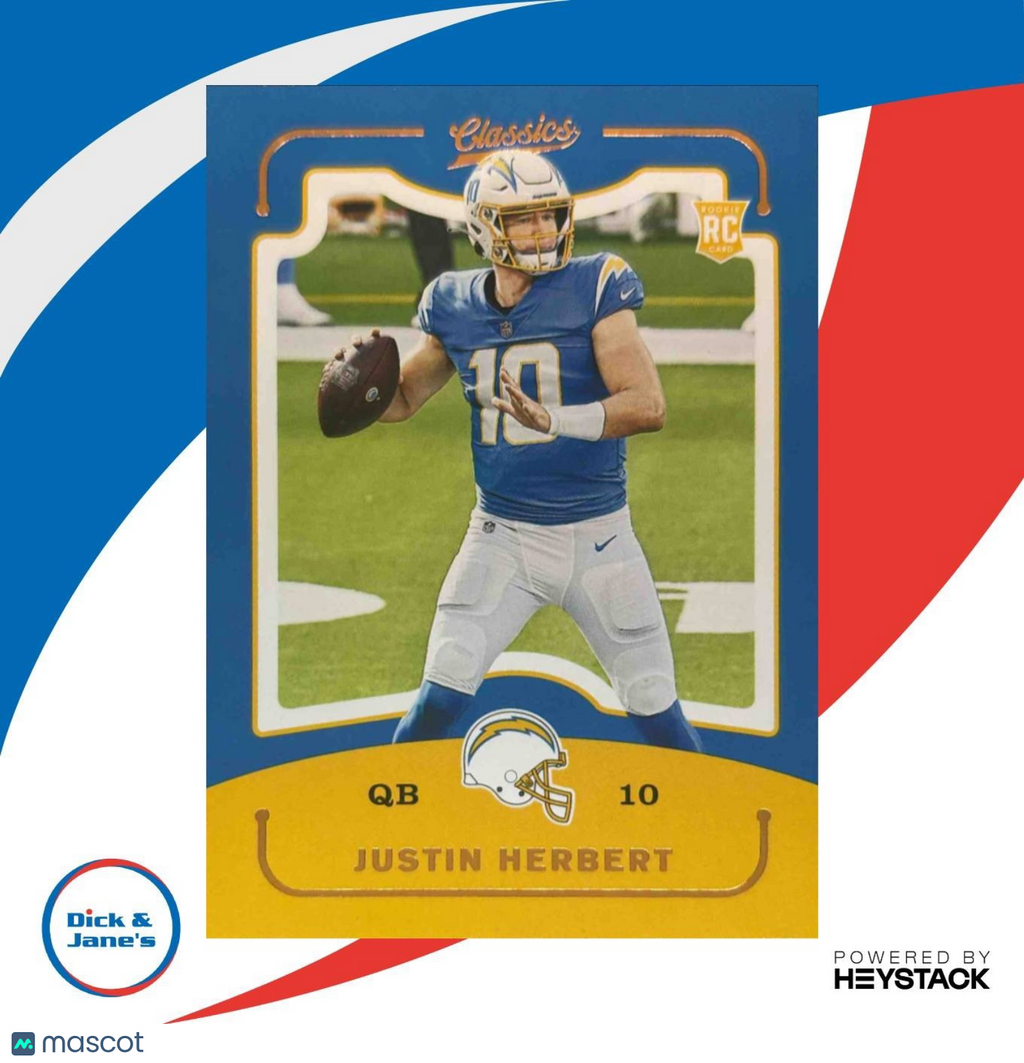 Add the impressive 2020 Panini Chronicles Justin Herbert Classics #CL-3 RC Los Angeles Chargers NFL trading card to your collection! This rookie card showcases the rising star quarterback in action, perfect for fans and collectors alike. Don't miss out on owning a piece of NFL history! Listed With Mascot.