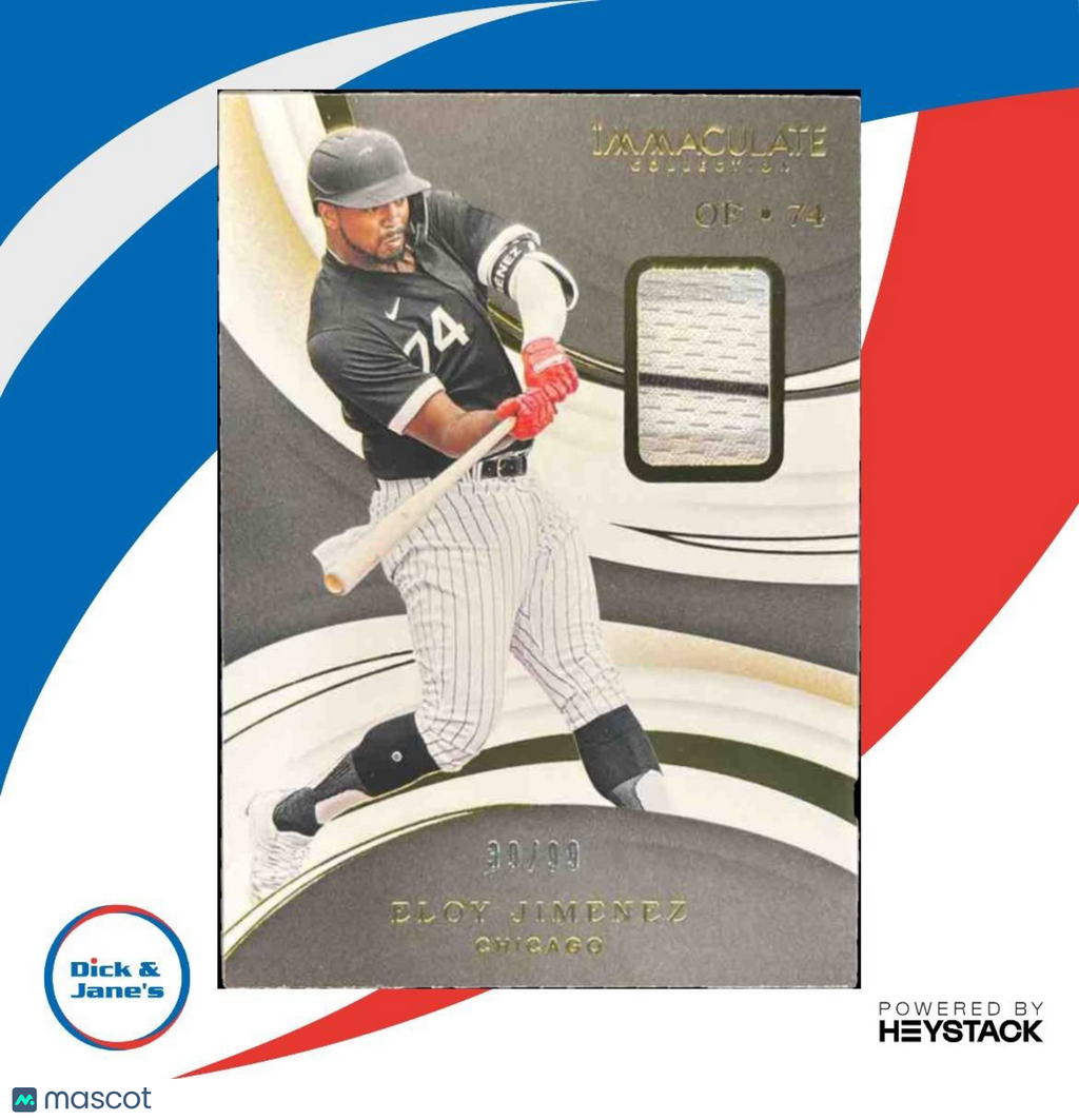 Get your hands on this rare 2020 Panini Immaculate Collection Eloy Jimenez trading card. Limited edition, only 99 made, featuring a game-worn memorabilia from the Chicago White Sox player. A must-have for any baseball card collector or Eloy Jimenez fan. Don't miss out on this unique piece of MLB history! Listed With Mascot.