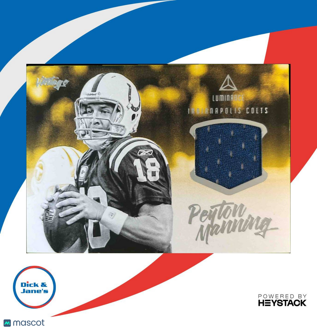 Showcase this rare 2020 Panini Luminance Peyton Manning Vintage Materials #VM7 sports trading card featuring a game-worn jersey relic from his time with the Indianapolis Colts. A must-have for any NFL collector, capturing a piece of football history with one of the greatest quarterbacks of all time. Listed With Mascot.