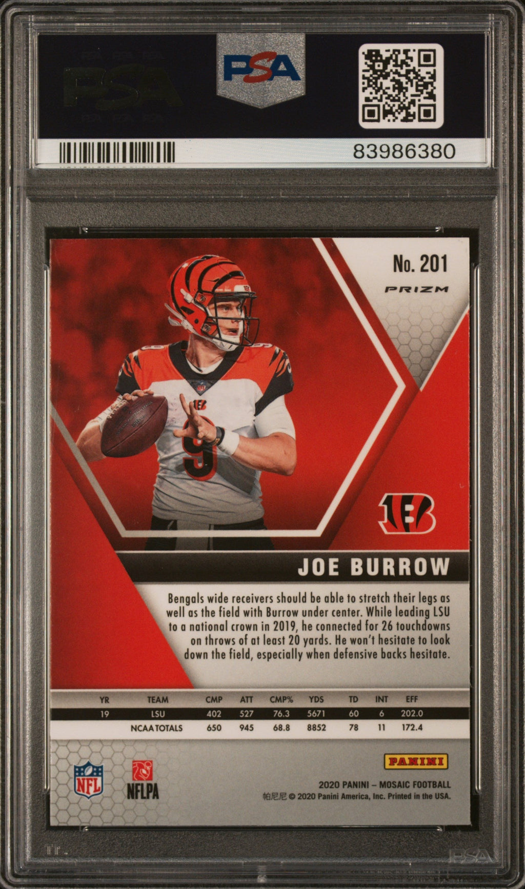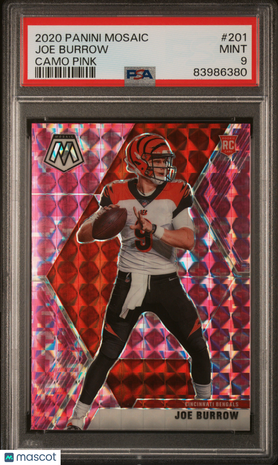 You are purchasing the following: 2020 Panini Mosaic Joe Burrow Camo Pink Rookie #201 PSA 9 Cincinnati Bengals. You will receive the exact item in the photographs. Note: Please do not connact us and asking the following: 1. What is the lowest you would take? Just make an offer. If the offer is automatically declined, you have your answer. 2. What the best you can do? See above. Not repling to an email is a reply. 3. Any room on this? See above. Not repling to an offer is a reply. 4. We ONLY do one counter offer, so please make your best offer the first time! Note: If the price off, in your option, please send your resaoning and an offer. We will review it. Note: We manage nearly 10 millon cards regularly and will adjust prices as errors are noticed or pointed out! Listed With Mascot.