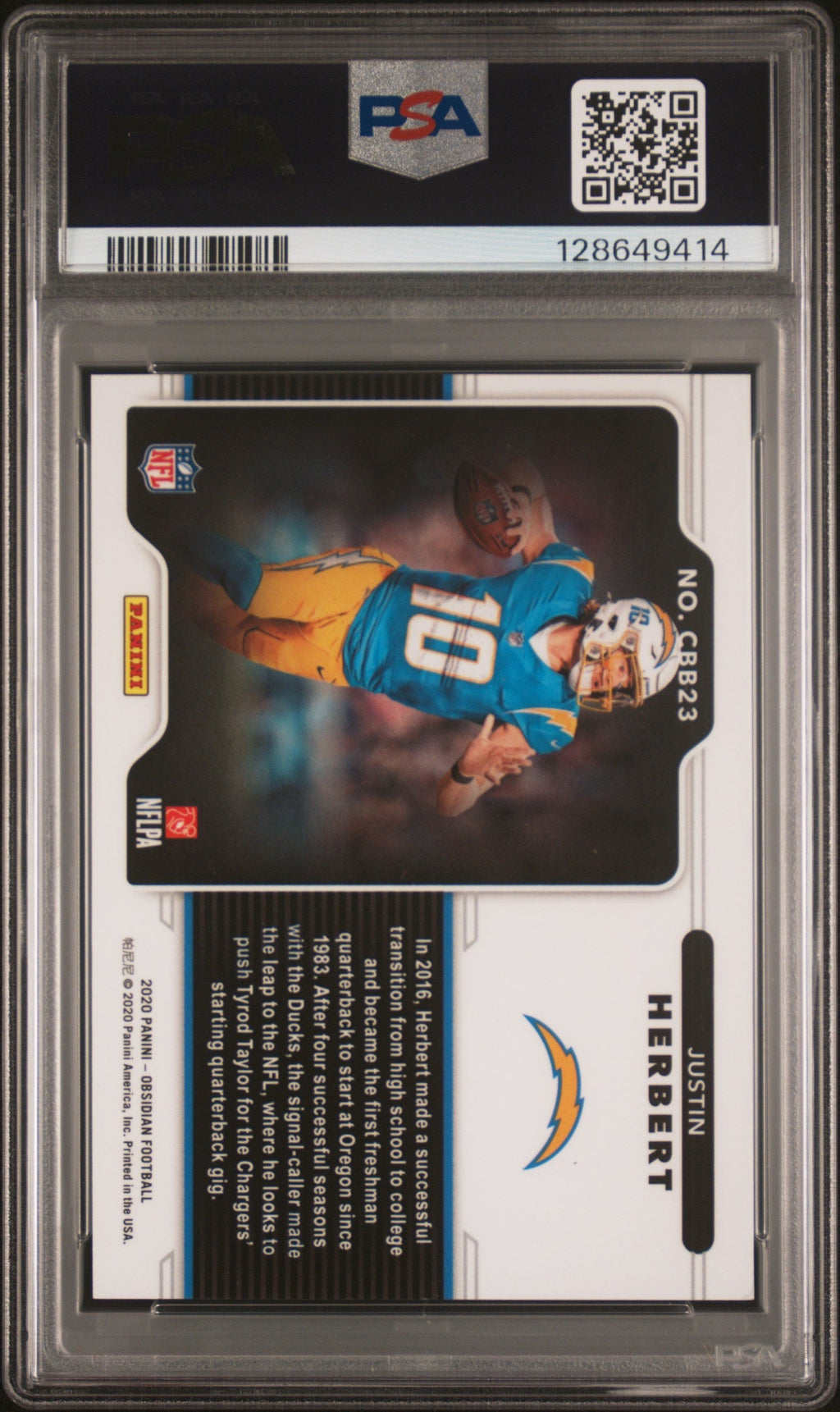 2020 Panini Obsidian Color Blast Black Justin Herbert Rookie SSP Case Hit PSA 9 Up for grabs is a stunning 2020 Panini Obsidian Color Blast Black Justin Herbert Rookie card, graded PSA 9! This sought-after SSP case hit is a true gem for any football card collector, featuring the superstar quarterback in his rookie year. With only 54 in the population and just 20 graded higher, this card is a rare find and a centerpiece for any serious Justin Herbert or NFL collection. Certified by Professional Sports Authenticator (PSA) and boasting a low population, this card stands out for its eye-catching design and scarcity. Don’t miss your chance to own a piece of football history—secure this incredible Justin Herbert rookie card today! Graded: Yes Population Higher: 20 Sport: Football Set: 2020 Panini Obsidian Color Blast Black Certification Number: 128649414 Grader: Professional Sports Authenticator (PSA) Manufacturer: Panini Population: 54 Player/Athlete: Justin Herbert Year Manufactured: 2020 Grade: 9 Features: Rookie Card Number: CBB23 Listed With Mascot.