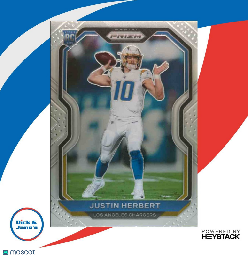 The 2020 Panini Prizm Justin Herbert card is a must-have for any Los Angeles Chargers or NFL fan. This rookie card features the highly sought-after rookie from the 2020 draft class. With a sleek design and quality printing by Panini, this card is a valuable addition to any collection. Don't miss out on owning a piece of NFL history with this Justin Herbert rookie card. Listed With Mascot.