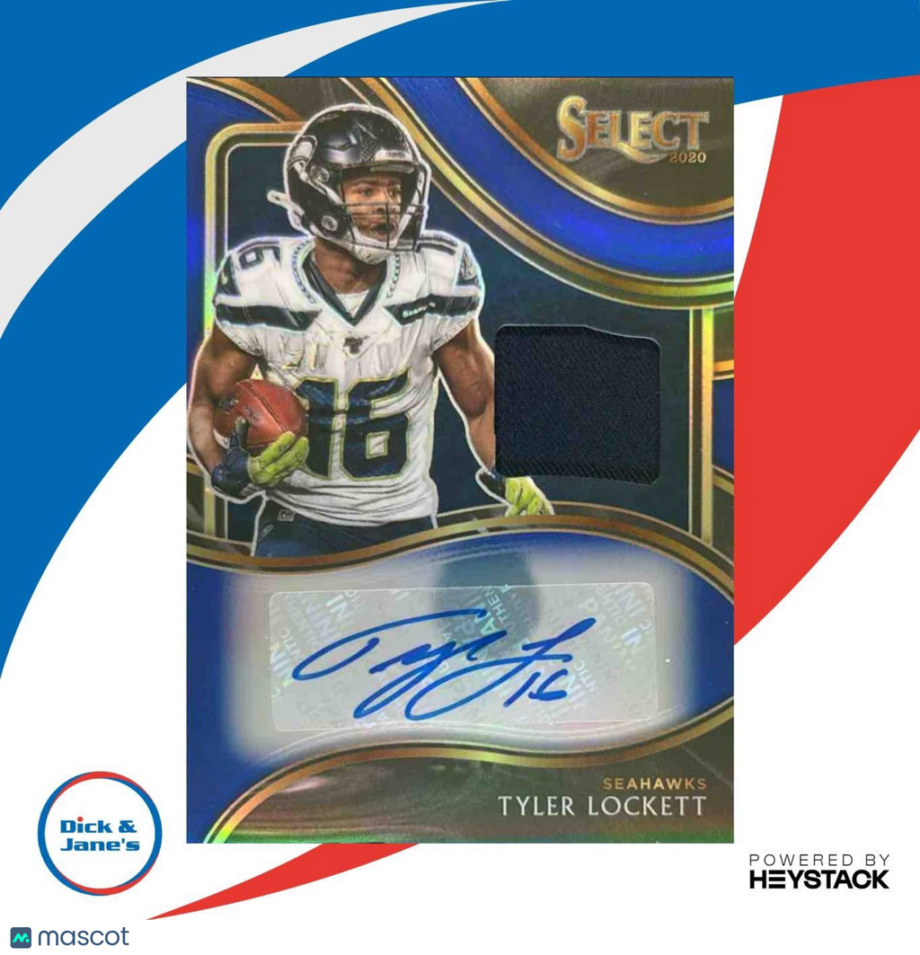 . The 2020 Panini Select Tyler Lockett Signature Memorabilia Blue /49 Auto Seahawks trading card is a rare find for any NFL fan. With a limited run of only 49 cards, this memorabilia card features an authentic autograph from Seattle Seahawks wide receiver, Tyler Lockett. This card is a must-have for any collector looking to add a unique and valuable piece to their collection. Don't miss out on the chance to own this exclusive sports trading card. Listed With Mascot.