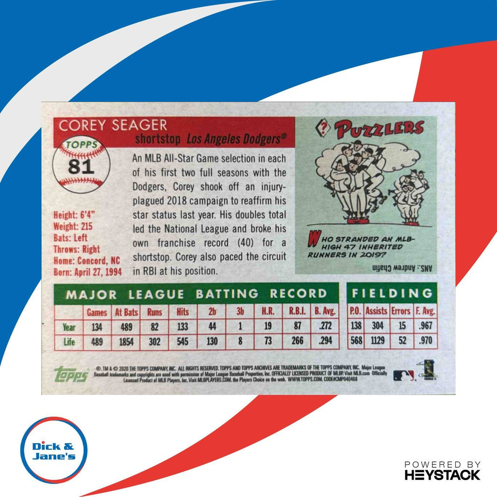 2020 Topps Archives Corey Seager Purple 24/175 #81 Los Angeles Dodgers Listed With Mascot.