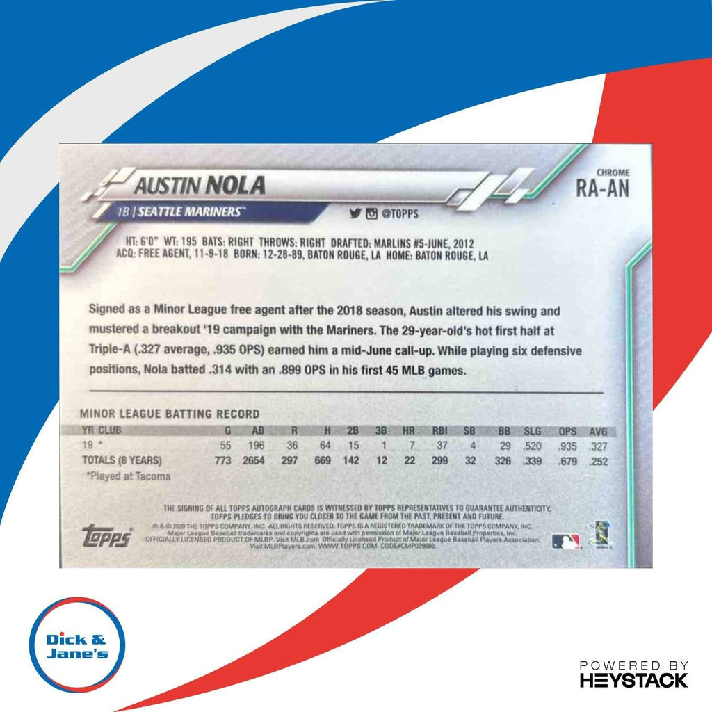 This rare 2020 Topps Chrome Austin Nola Rookie Auto #RA-AN RC Seattle Mariners trading card is a must-have for any MLB card collector. Featuring a unique autograph from the rising star, this card is the perfect addition to any sports memorabilia collection. Don't miss out on this limited edition piece of baseball history! Listed With Mascot.