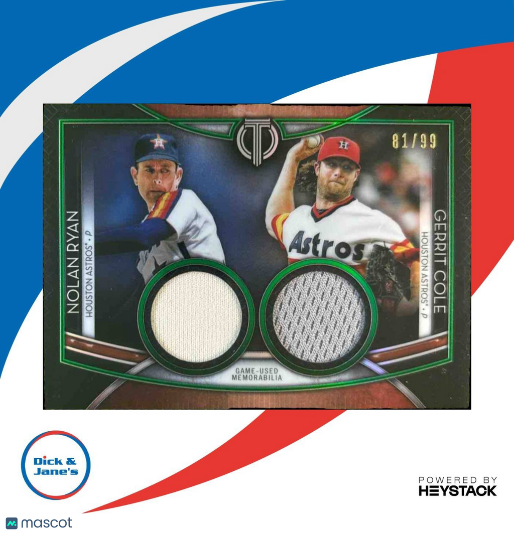 The 2020 Topps Tribute Nolan Ryan Gerrit Cole Dual Relics Player Green /99 Astros card features two standout MLB players with game-worn jersey pieces. Limited to just 99 copies, this rare collectible is a must-have for any baseball card enthusiast. Perfect addition to any sports memorabilia collection! Listed With Mascot.