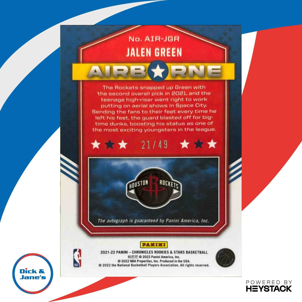 2021-22 Chronicles Jalen Green Airborne Signatures 21/49 Auto RC Houston Rockets Listed With Mascot.