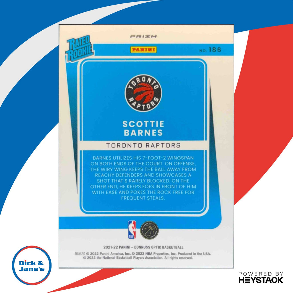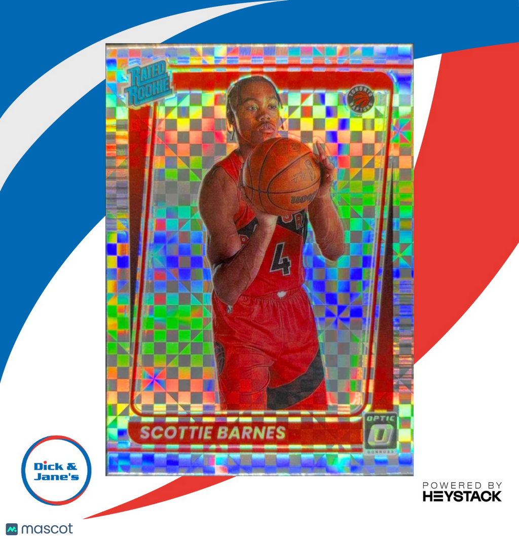 An exciting addition to any basketball card collection, the 2021-22 Panini Donruss Optic Scottie Barnes Checkerboard Prizm RC card features the rising star from the Toronto Raptors. A rare and sought-after rookie card, this checkerboard prizm edition is a must-have for fans and collectors alike. Don't miss out on adding this gem to your collection! Listed With Mascot.