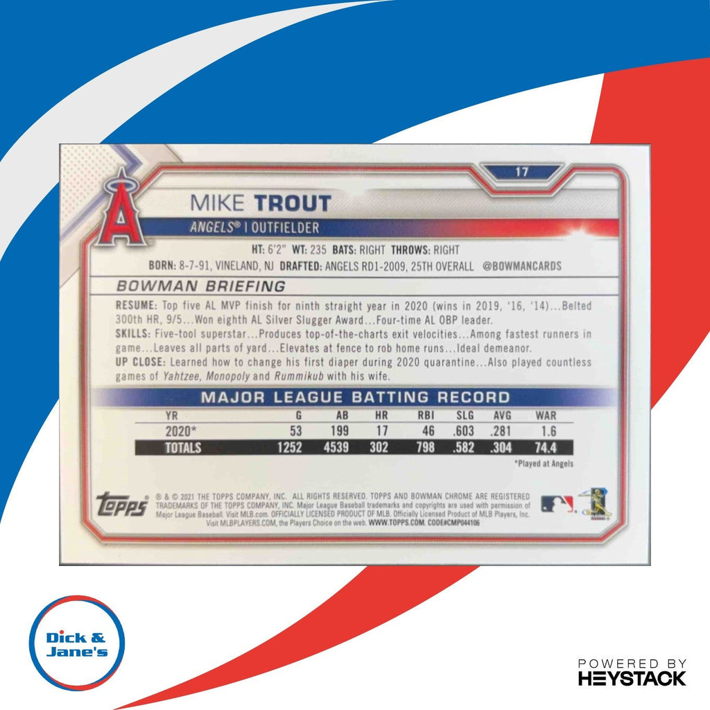 A highly sought-after 2021 Bowman Mike Trout Purple trading card, numbered 9 out of 250. Featuring the legendary Los Angeles Angels player in stunning detail. A must-have for any baseball card collector or fan of the game. Don't miss out on adding this rare and valuable card to your collection! Listed With Mascot.