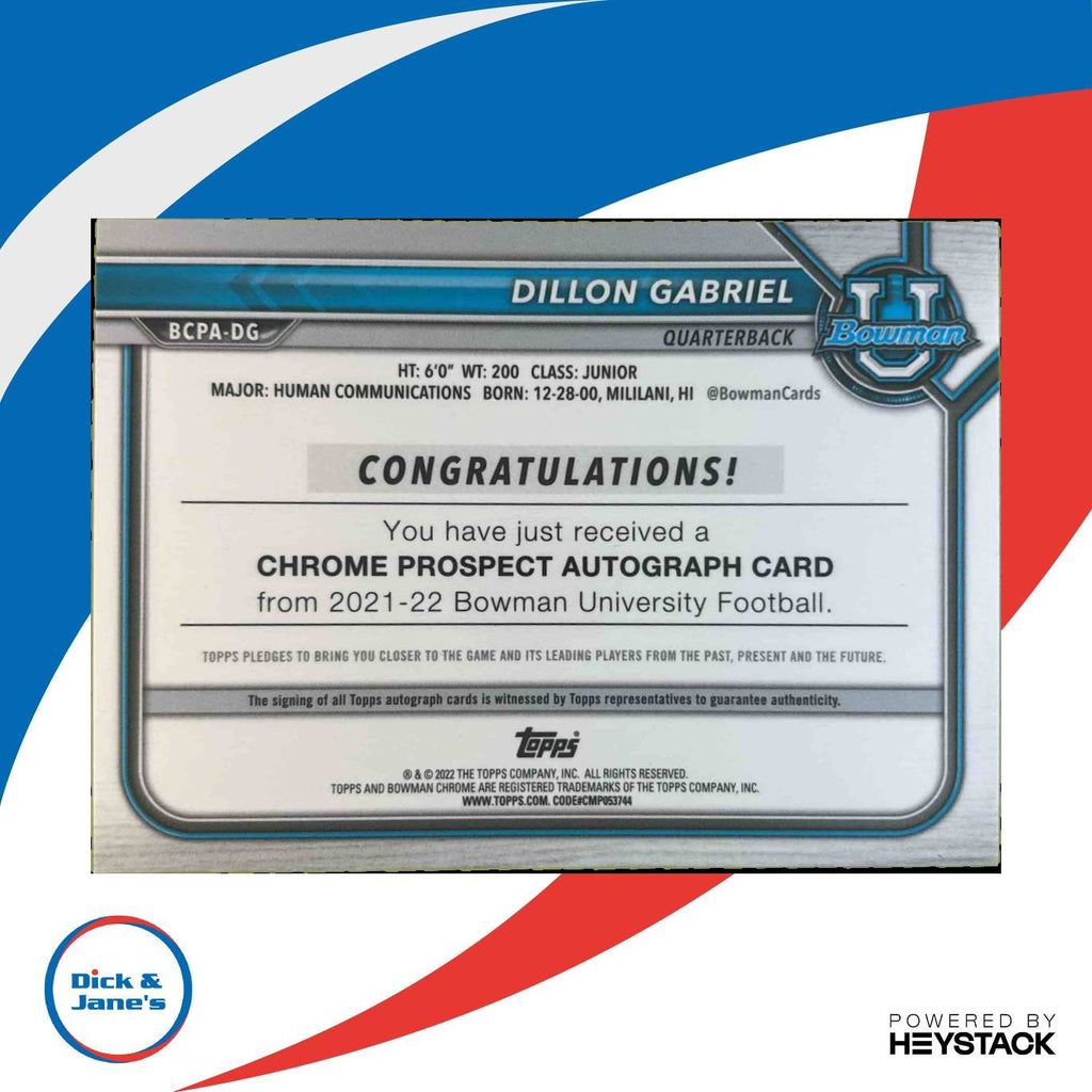 This limited edition 2021 Bowman University Dillon Gabriel Chrome Prospects auto refractor card is a must-have for any sports card collector. Featuring a signature from the rising star quarterback, this rare find is sure to be a valuable addition to your collection. Don't miss out on owning a piece of sports history! Listed With Mascot.