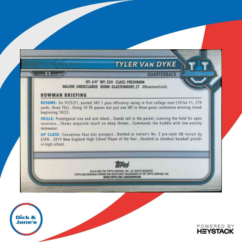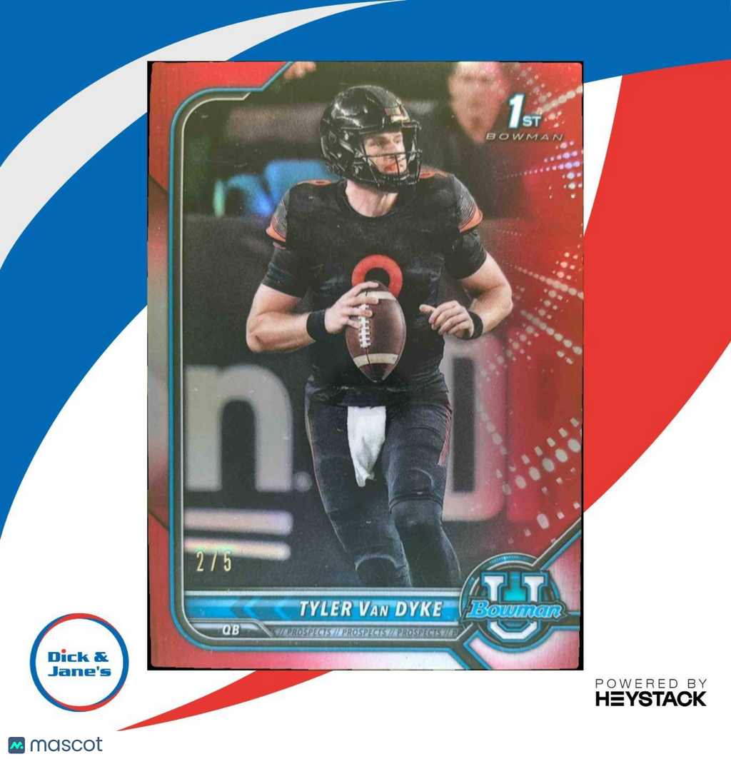 . Get your hands on this rare 2021 Bowman University Tyler Van Dyke Chrome Red trading card, numbered 2 out of 5! Featuring the talented quarterback from the Miami Hurricanes, this NCAAF card is a must-have for any sports card collector. Don't miss your chance to add this limited edition gem to your collection today! Listed With Mascot.