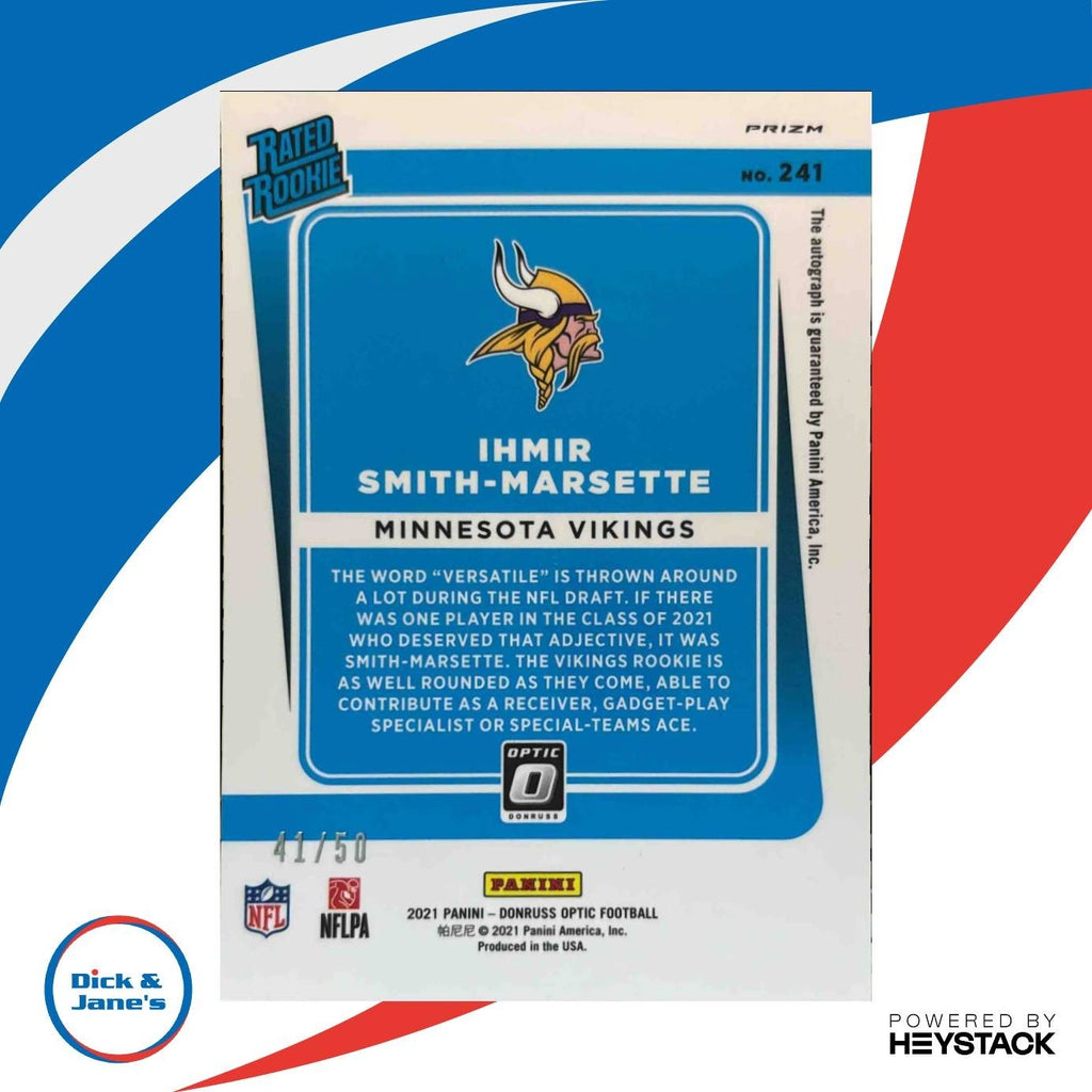 Get your hands on this rare 2021 Donruss Optic Ihmir Smith-Marsette trading card! Featuring a pink velocity design with only 50 made, this rookie card is a must-have for any Vikings fan or NFL collector. Don't miss out on owning a piece of football history with this autographed gem. Listed With Mascot.
