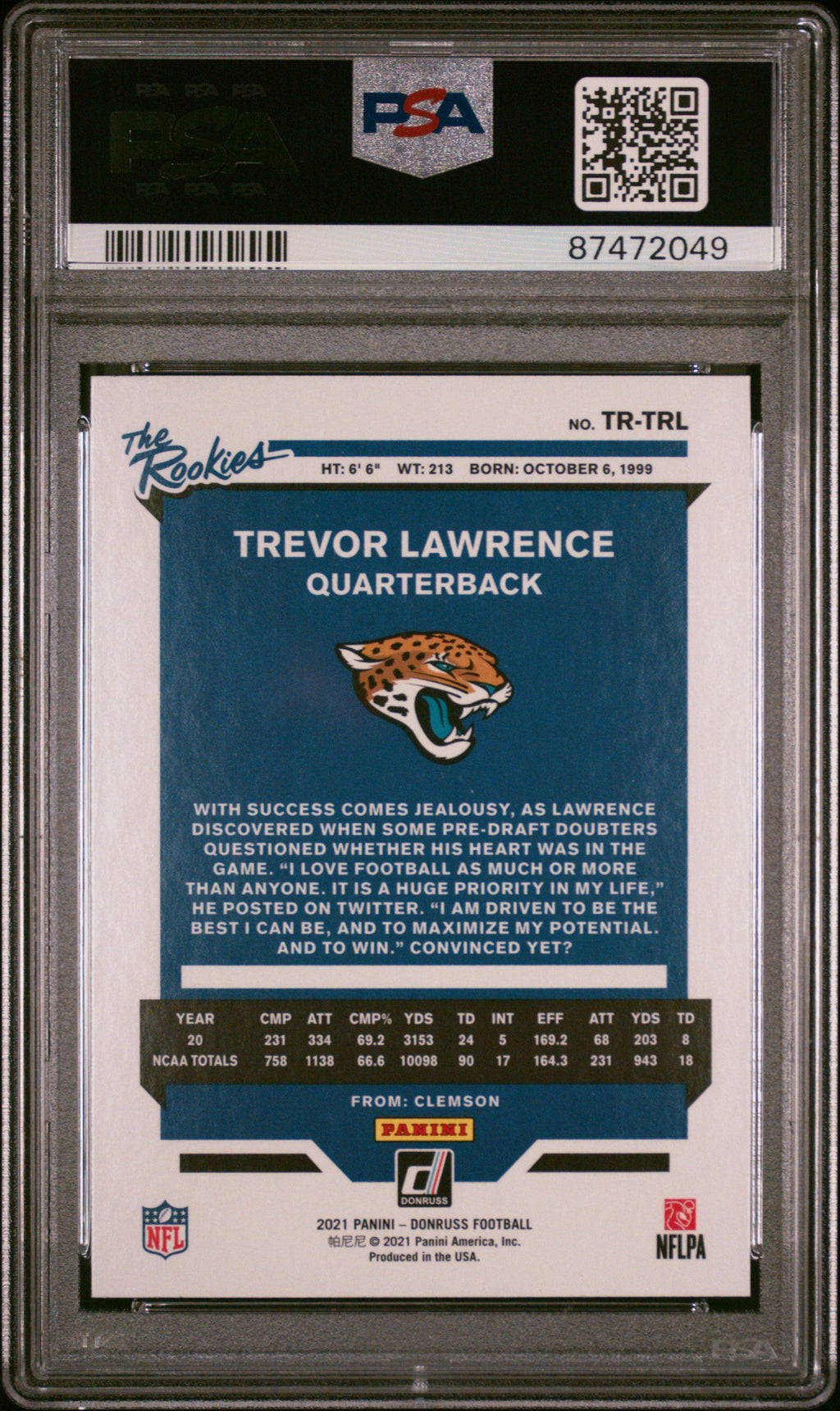You are purchasing the following: 2021 Panini Donruss The Rookies Trevor Lawrence Rookie #TR-TRL PSA 10 Jacksonville Jaguars. You will receive the exact item in the photographs. Note: Please do not connact us and asking the following: 1. What is the lowest you would take? Just make an offer. If the offer is automatically declined, you have your answer. 2. What the best you can do? See above. Not repling to an email is a reply. 3. Any room on this? See above. Not repling to an offer is a reply. 4. We ONLY do one counter offer, so please make your best offer the first time! Note: If the price off, in your option, please send your resaoning and an offer. We will review it. Note: We manage nearly 10 millon cards regularly and will adjust prices as errors are noticed or pointed out! Listed With Mascot.