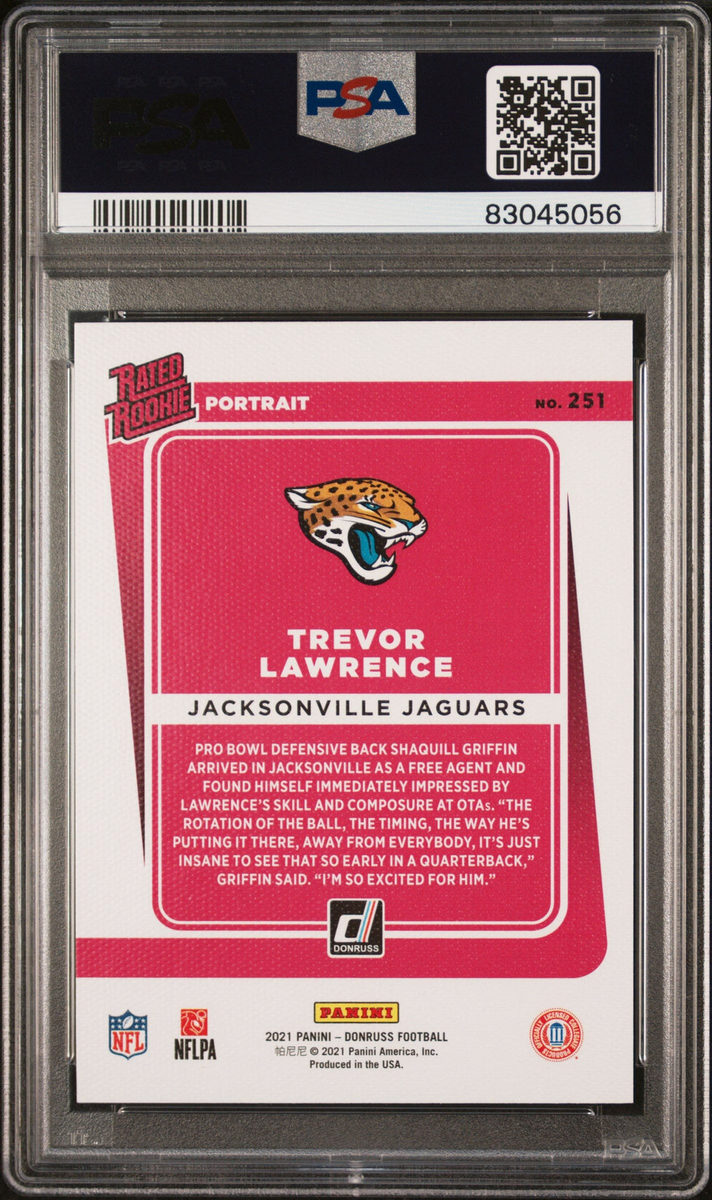You are purchasing the following: 2021 Panini Donruss Trevor Lawrence Portrait Rookie #251 PSA 9 Jacksonville Jaguars. You will receive the exact item in the photographs. Note: Please do not connact us and asking the following: 1. What is the lowest you would take? Just make an offer. If the offer is automatically declined, you have your answer. 2. What the best you can do? See above. Not repling to an email is a reply. 3. Any room on this? See above. Not repling to an offer is a reply. 4. We ONLY do one counter offer, so please make your best offer the first time! Note: If the price off, in your option, please send your resaoning and an offer. We will review it. Note: We manage nearly 10 millon cards regularly and will adjust prices as errors are noticed or pointed out! Listed With Mascot.
