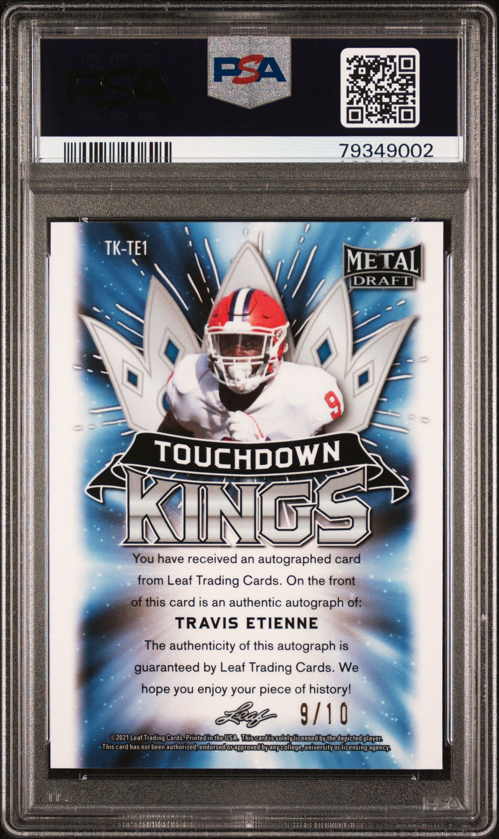 You are purchasing a 2021 Leaf Metal Draft Touchdown Kings Autographs Travis Etienne TD Pink Wave #TKTE1 PSA 10. JERSEY MATCH POP 1 You will receive the exact item in the photographs. Thank you for looking. Listed With Mascot.