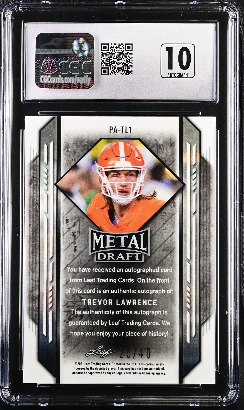 You are purchasing the following: 2021 Leaf Metal Draft Trevor Lawrence Blue Marble 25/40 Rookie Portrait Autographs #PA-TL1 CGC 10 Jacksonville Jaguars. You will receive the exact item in the photographs. Note: Please do not connact us and asking the following: 1. What is the lowest you would take? Just make an offer. If the offer is automatically declined, you have your answer. 2. What the best you can do? See above. Not repling to an email is a reply. 3. Any room on this? See above. Not repling to an offer is a reply. 4. We ONLY do one counter offer, so please make your best offer the first time! Note: If the price off, in your option, please send your resaoning and an offer. We will review it. Note: We manage nearly 10 millon cards regularly and will adjust prices as errors are noticed or pointed out! Listed With Mascot.