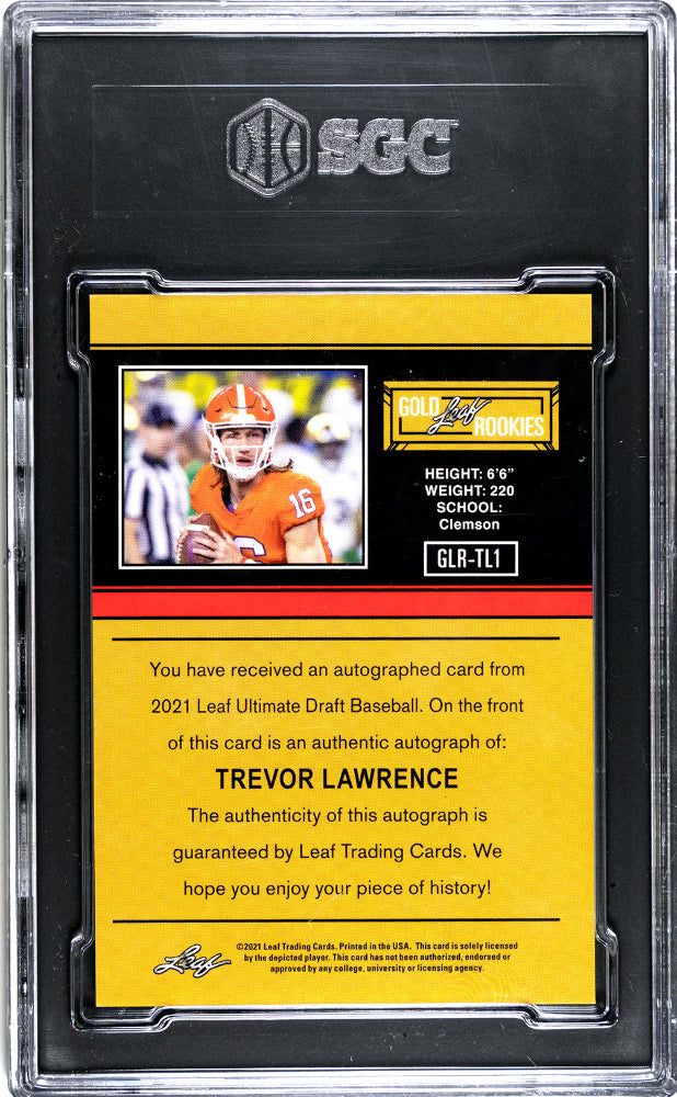 You are purchasing the following: 2021 Leaf Ultimate Draft Trevor Lawrence '91 Design Autograph Platinum Spectrum 27/30 Rookie #GLR-TL1 SGC 9 Jacksonville Jaguars. You will receive the exact item in the photographs. Note: Please do not connact us and asking the following: 1. What is the lowest you would take? Just make an offer. If the offer is automatically declined, you have your answer. 2. What the best you can do? See above. Not repling to an email is a reply. 3. Any room on this? See above. Not repling to an offer is a reply. 4. We ONLY do one counter offer, so please make your best offer the first time! Note: If the price off, in your option, please send your resaoning and an offer. We will review it. Note: We manage nearly 10 millon cards regularly and will adjust prices as errors are noticed or pointed out! Listed With Mascot.