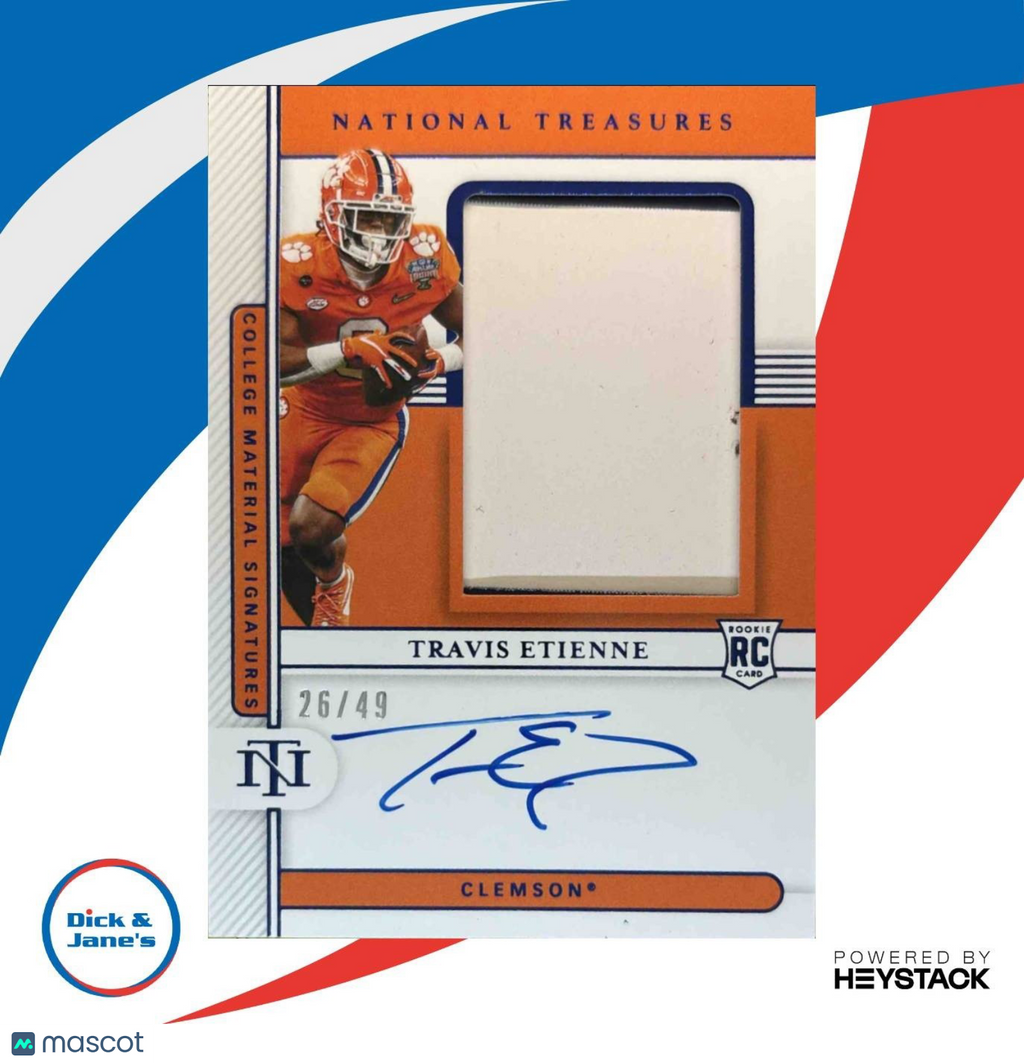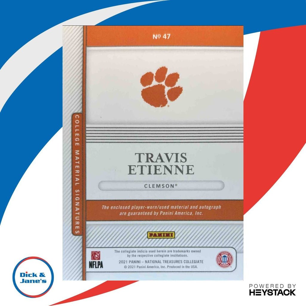 Collect the highly coveted 2021 National Treasures Collegiate Travis Etienne Jr. Blue #47 MEM Auto RC trading card featuring a rare autograph and limited edition blue parallel. This NCAAF card is a must-have for any football card collector looking to add a unique and valuable piece to their collection. Don't miss out on the opportunity to own a piece of sports history with this exclusive card. Listed With Mascot.