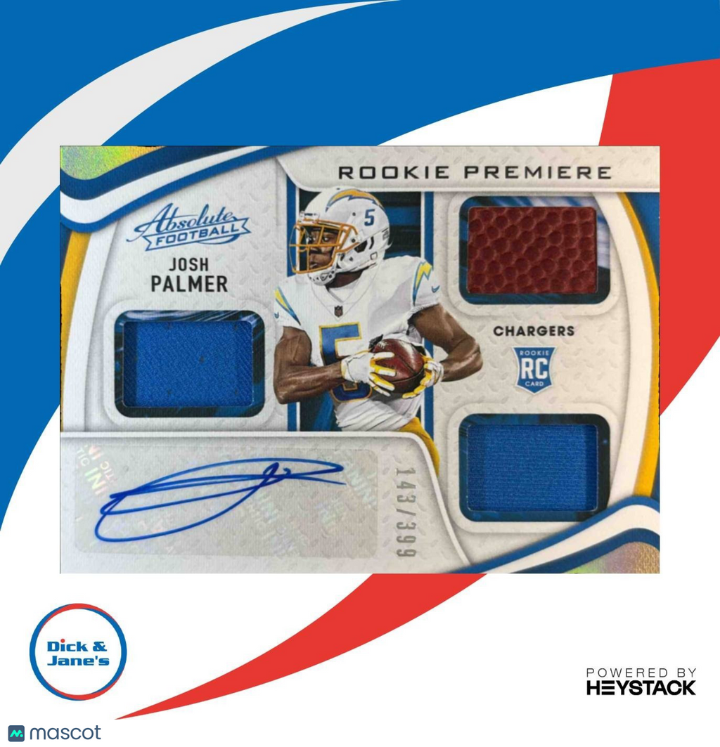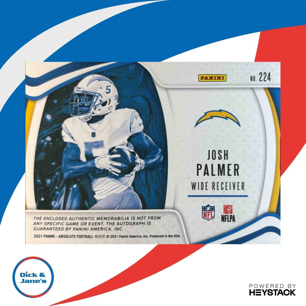 Own a piece of NFL history with this limited edition 2021 Panini Absolute Josh Palmer trading card. Numbered 143 out of 399, this card features an authentic autograph from the Chargers' rising star, Josh Palmer. Don't miss your chance to add this MEM Rated Prospect Auto to your collection today! Listed With Mascot.