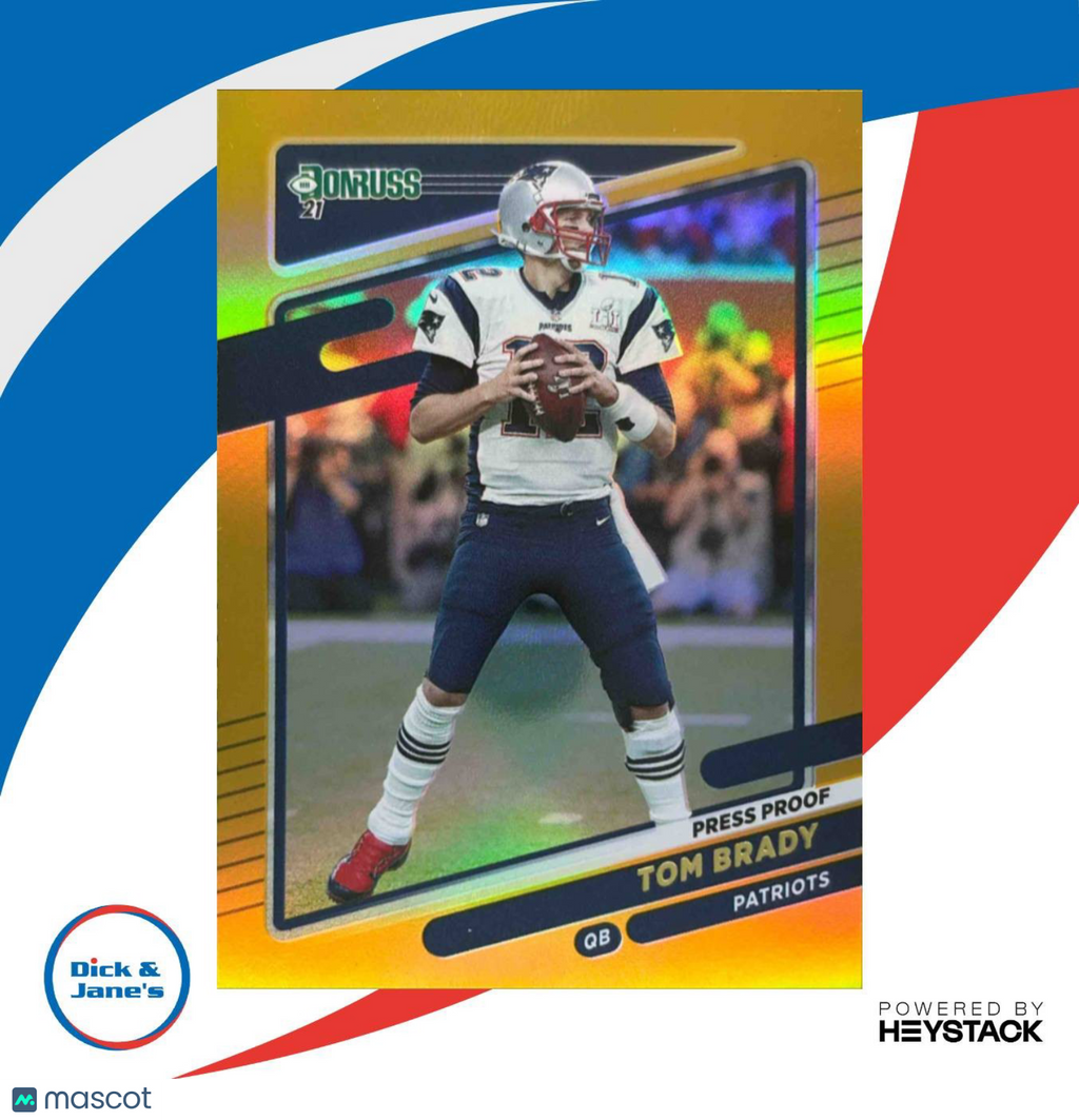 2021 Panini Donruss Tom Brady Press Proof Premium Gold Holo New England Patriots Listed With Mascot.