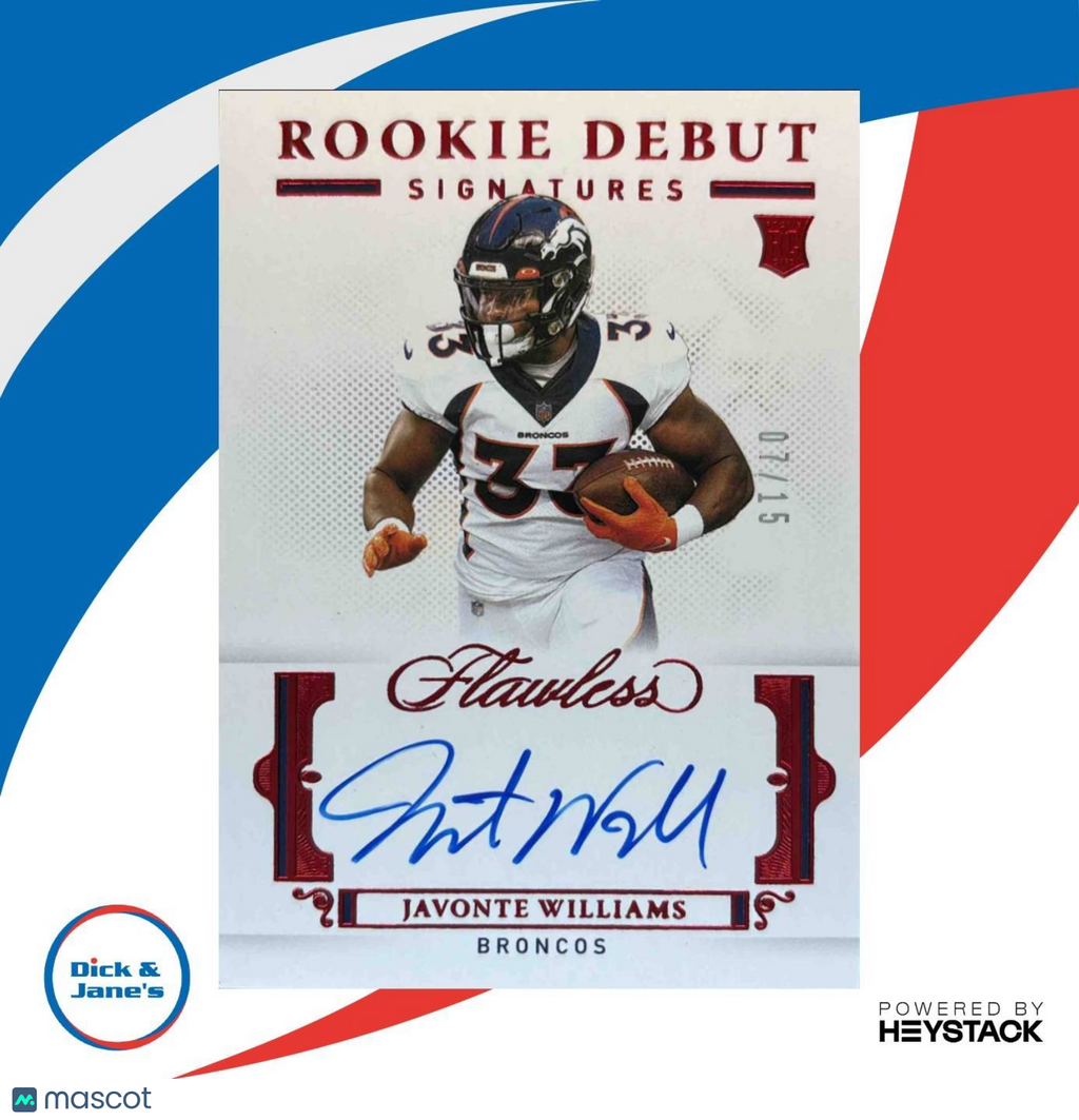Own a piece of NFL history with this rare 2021 Panini Flawless Javonte Williams Rookie Debut Signatures Ruby card. Limited to only 15 copies, this autographed rookie card showcases the Denver Broncos' rising star. Don't miss out on adding this gem to your collection! Listed With Mascot.