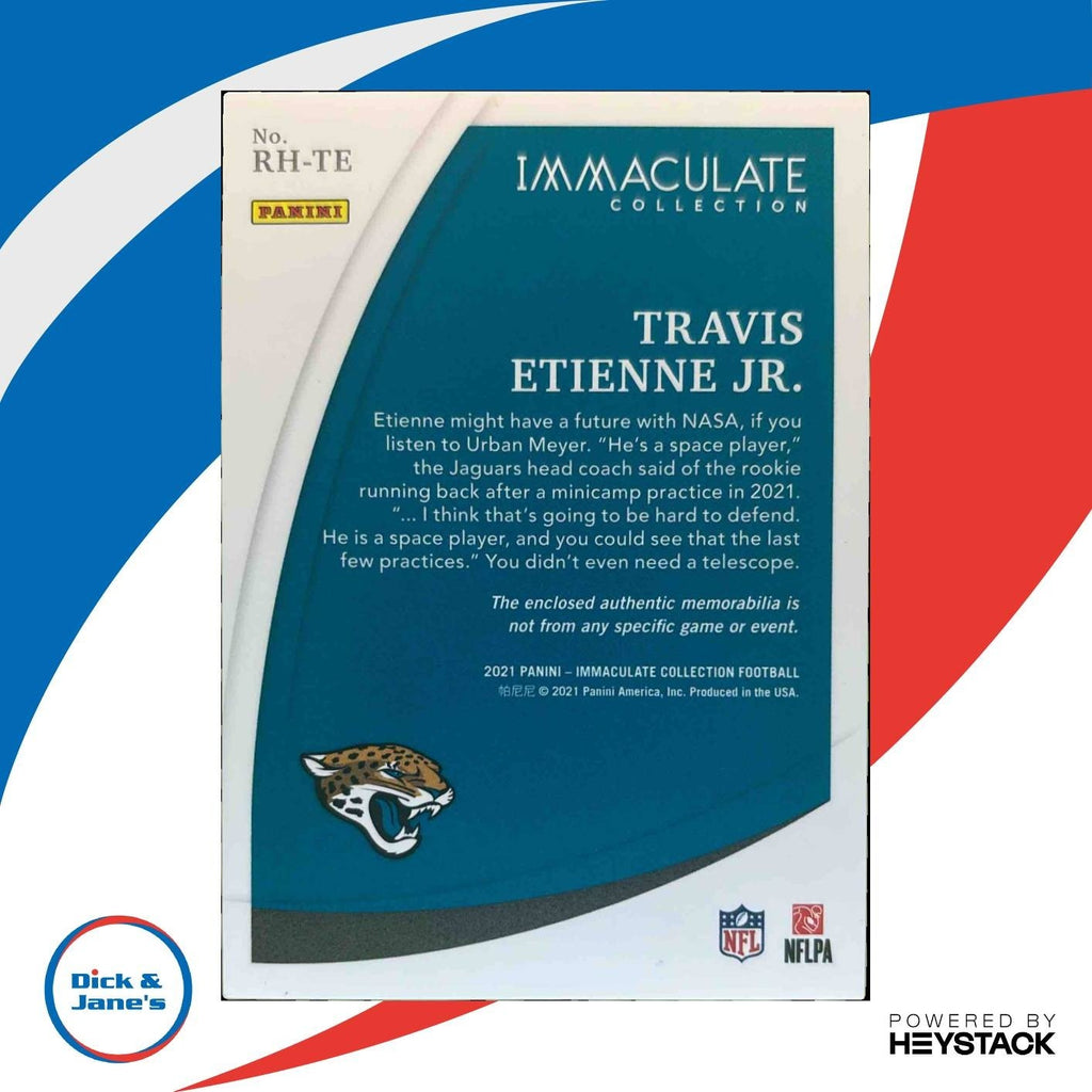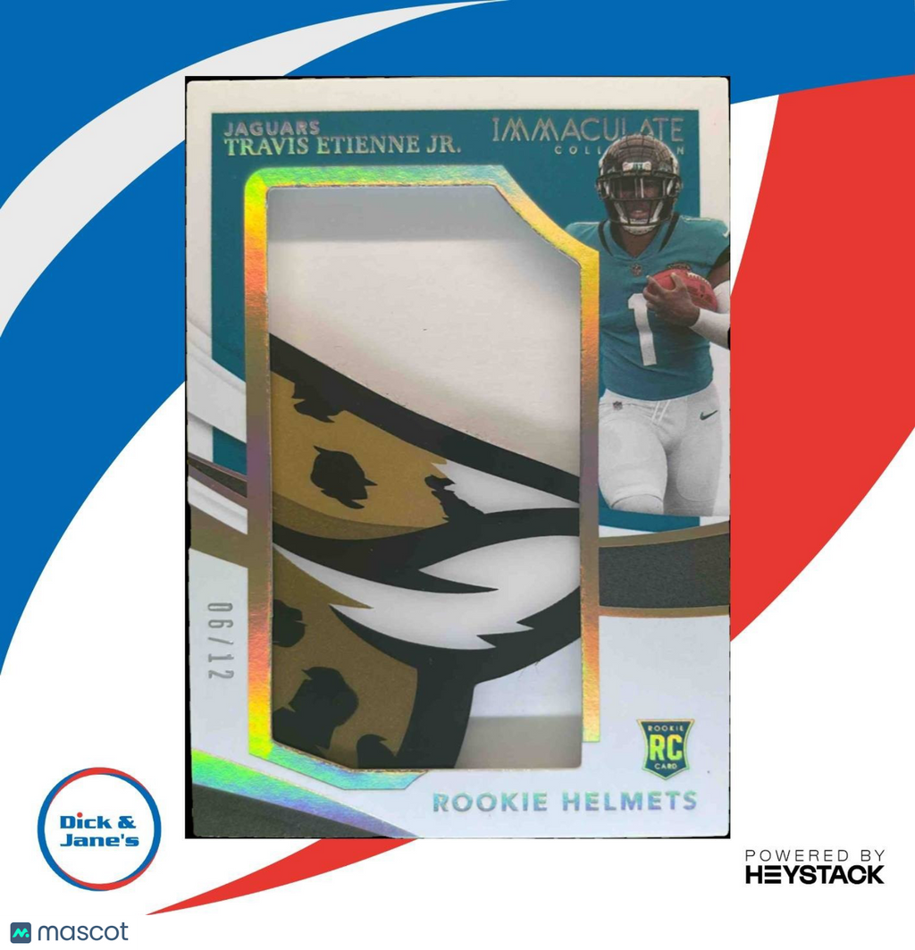 Own a piece of NFL history with this 2021 Panini Immaculate Travis Etienne Jr. Helmet trading card. This rare collectible features a game-worn helmet relic from the Jacksonville Jaguars rookie running back. Limited to only 12 copies, this card is a must-have for any football card collector. Don't miss out on adding this MEM RC card to your collection! Listed With Mascot.