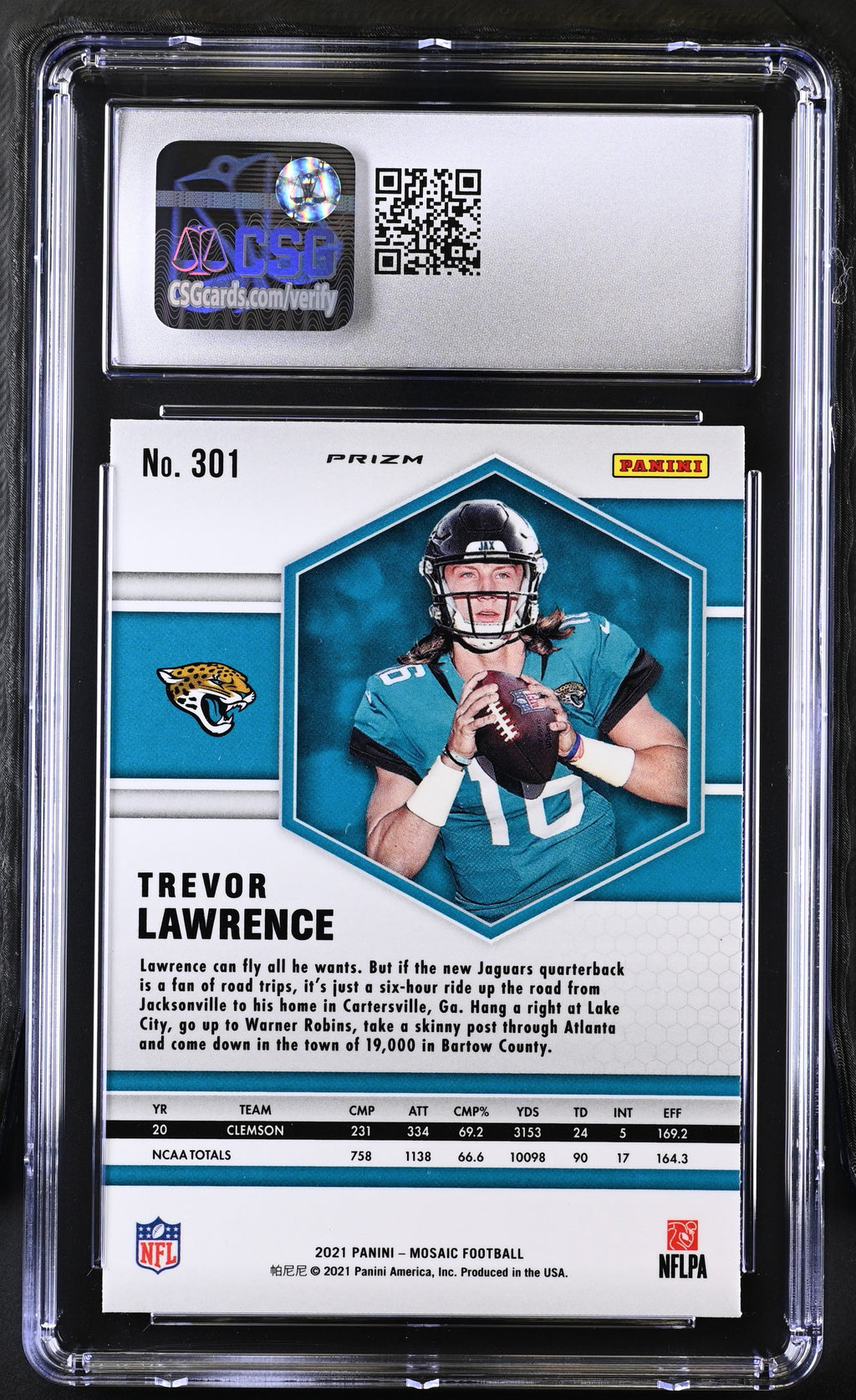 2021 Panini Mosaic Trevor Lawrence Silver Rookie #301 CGC 9.5 MINT+ Jacksonville Jaguars Don’t miss your chance to own this highly sought-after 2021 Panini Mosaic Trevor Lawrence Silver Rookie card (#301), professionally graded CGC 9.5 MINT+! 🌟 As the #1 overall pick in the 2021 NFL Draft, Trevor Lawrence made a huge impact in his rookie year with the Jacksonville Jaguars, quickly becoming one of football’s most promising young quarterbacks. This Silver parallel is a must-have for any serious collector or Jaguars fan looking to invest in the future of the NFL! This card stands out with its impressive CGC 9.5 grade and is the only one of its kind in the population—truly a rare find! 🏈 Featuring the official rookie card designation and certified authenticity, it’s perfect for display or as a long-term investment. Secure this gem before it’s gone and add a centerpiece to your football card collection today! Set: 2021 Panini Mosaic Certification Number: 1021505003 Grader: Certified Guaranty Company (CGC) Grade: 9.5 Year Manufactured: 2021 Player/Athlete: Trevor Lawrence Graded: Yes Sport: Football Parallel/Variety: Silver Manufacturer: Panini Population: 1 Team: Jacksonville Jaguars Features: Rookie Card Number: 301 Listed With Mascot.
