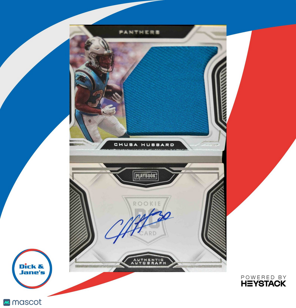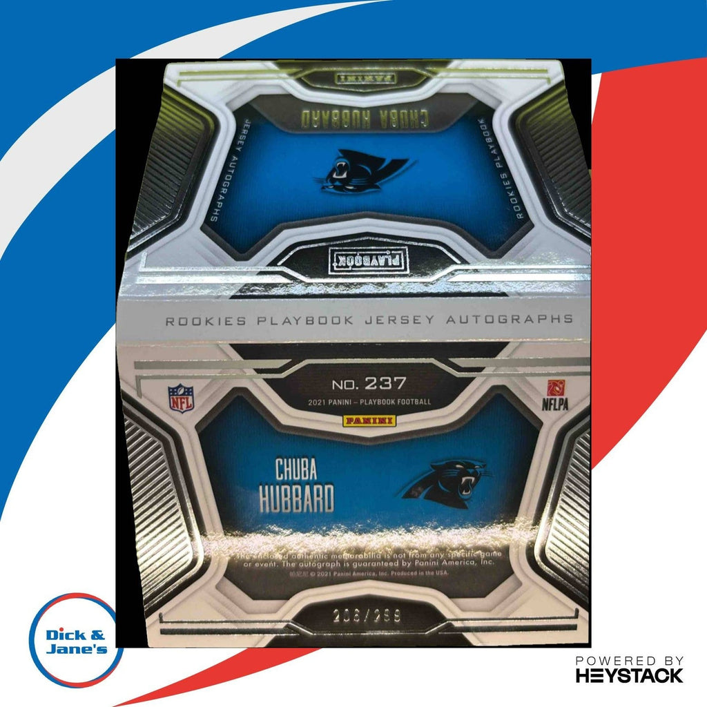 Own a piece of NFL history with the 2021 Panini Playbook Chuba Hubbard /299 #237 RC Auto Carolina Panthers trading card. This rare card features a rookie autograph of rising star Chuba Hubbard and is sure to be a prized addition to any collection. Don't miss out on this limited edition card! Listed With Mascot.