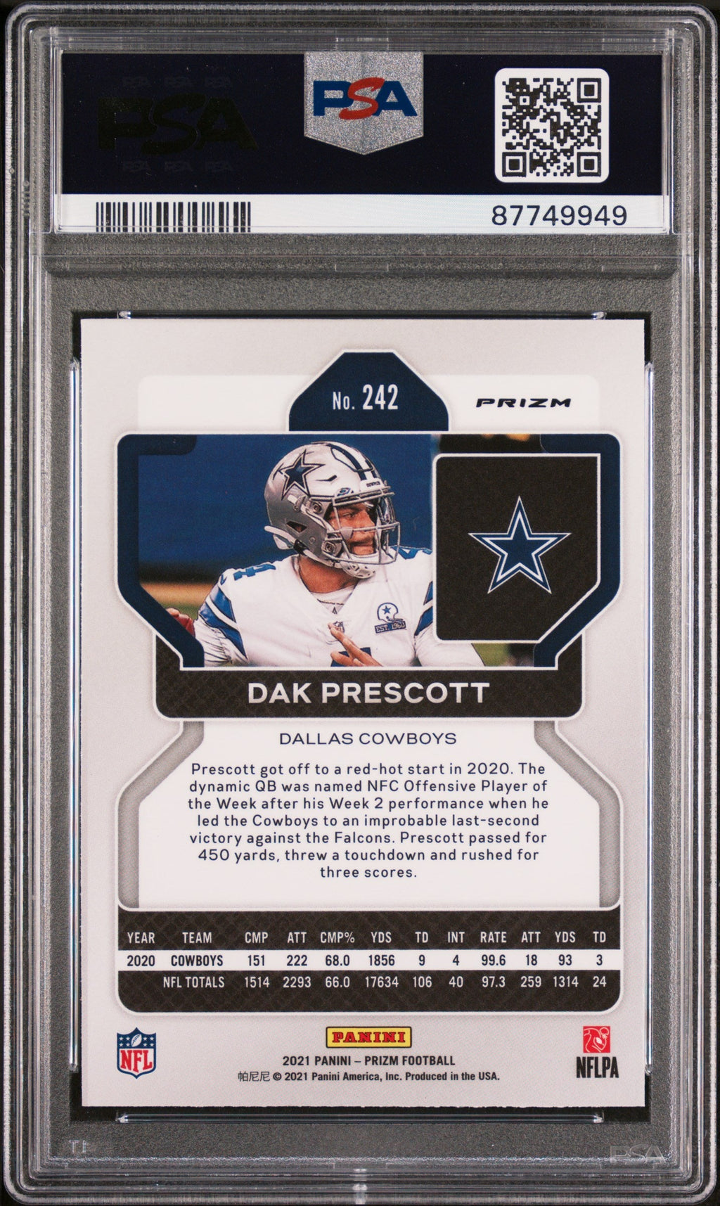 You are purchasing the following: 2021 Panini Prizm Dak Prescott Silver #242 PSA 9 Dallas Cowboys. You will receive the exact item in the photographs. Note: Please do not connact us and asking the following: 1. What is the lowest you would take? Just make an offer. If the offer is automatically declined, you have your answer. 2. What the best you can do? See above. Not repling to an email is a reply. 3. Any room on this? See above. Not repling to an offer is a reply. 4. We ONLY do one counter offer, so please make your best offer the first time! Note: If the price off, in your option, please send your resaoning and an offer. We will review it. Note: We manage nearly 10 millon cards regularly and will adjust prices as errors are noticed or pointed out! Listed With Mascot.
