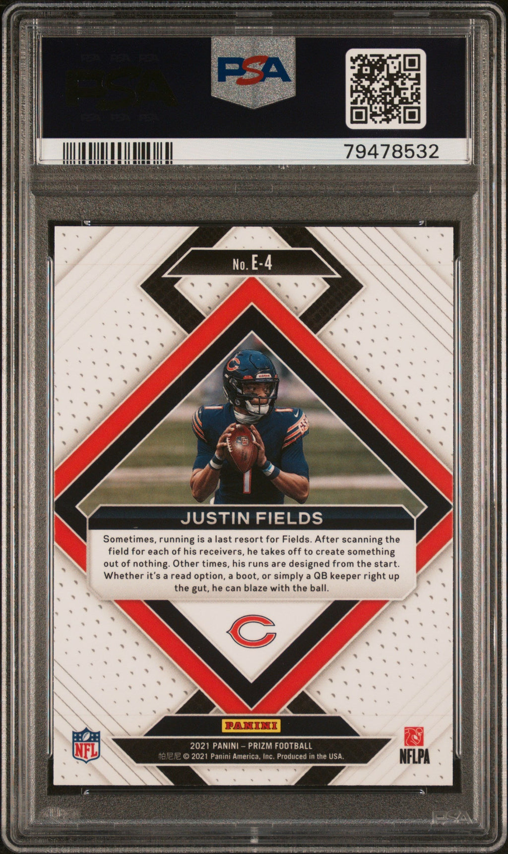 2021 Panini Prizm Emergent Justin Fields Rookie E4 PSA 10 GEM MINT Chicago Bears Don’t miss your chance to own this stunning 2021 Panini Prizm Emergent Justin Fields Rookie card, graded PSA 10 GEM MINT! This highly sought-after card features the dynamic Chicago Bears quarterback in his rookie season, making it a must-have for serious football collectors and fans. With a population of just 167 and none graded higher, this card stands out as a true gem for any collection. Certified by Professional Sports Authenticator (PSA) with certification number 79478532, this card boasts pristine condition and exceptional eye appeal. Whether you’re a dedicated Justin Fields supporter or a collector seeking high-grade rookie cards, this is the perfect investment piece for your collection. Act fast—rare cards like this don’t last long! Set: 2021 Panini Prizm Emergent Certification Number: 79478532 Grader: Professional Sports Authenticator (PSA) Year Manufactured: 2021 Grade: 10 Player/Athlete: Justin Fields Graded: Yes Sport: Football Population Higher: 0 Manufacturer: Panini Population: 167 Team: Chicago Bears Features: Rookie Card Number: E4 Listed With Mascot.