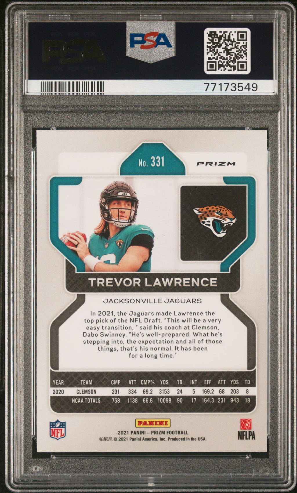 You are purchasing the following: 2021 Panini Prizm Trevor Lawrence Lazer Rookie #331 PSA 10 Jacksonville Jaguars. You will receive the exact item in the photographs. Note: Please do not connact us and asking the following: 1. What is the lowest you would take? Just make an offer. If the offer is automatically declined, you have your answer. 2. What the best you can do? See above. Not repling to an email is a reply. 3. Any room on this? See above. Not repling to an offer is a reply. 4. We ONLY do one counter offer, so please make your best offer the first time! Note: If the price off, in your option, please send your resaoning and an offer. We will review it. Note: We manage nearly 10 millon cards regularly and will adjust prices as errors are noticed or pointed out! Listed With Mascot.