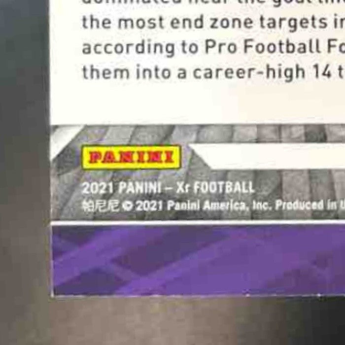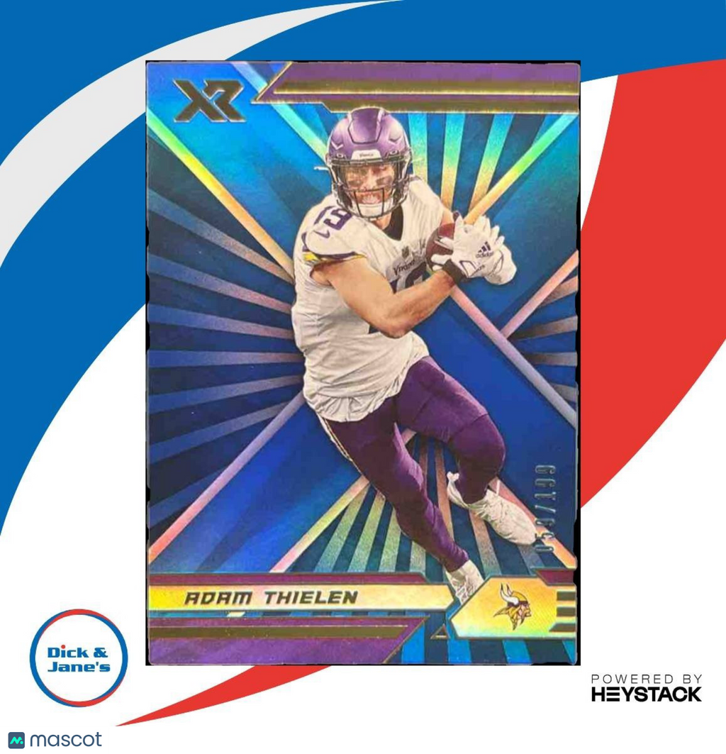 This 2021 Panini XR Adam Thielen Blue trading card is a must-have for any Minnesota Vikings fan. Limited edition, numbered /199, this NFL card features the star receiver in a striking blue design. Add this rare collectible to your sports memorabilia today! Listed With Mascot.