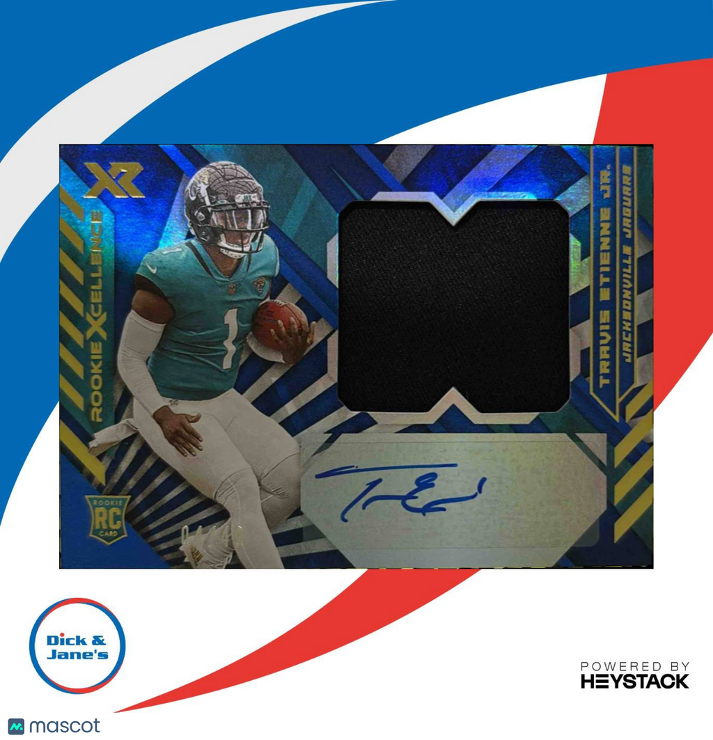 Own a piece of NFL history with this 2021 Panini XR Travis Etienne Jr. Rookie XL Swatch Autograph trading card. Featuring a rare blue variation limited to just 49 copies, this card is a must-have for any Jacksonville Jaguars fan or collector. Don't miss your chance to own a piece of this rookie sensation's journey to the top of the NFL! Listed With Mascot.
