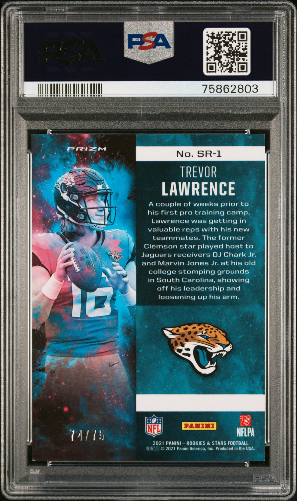 You are purchasing the following: 2021 Panini Rookies & Stars Stellar Rookies Trevor Lawrence RKE Pink Rookie /75 #SR-1 PSA 9 Jacksonville Jaguars. You will receive the exact item in the photographs. Note: Please do not connact us and asking the following: 1. What is the lowest you would take? Just make an offer. If the offer is automatically declined, you have your answer. 2. What the best you can do? See above. Not repling to an email is a reply. 3. Any room on this? See above. Not repling to an offer is a reply. 4. We ONLY do one counter offer, so please make your best offer the first time! Note: If the price off, in your option, please send your resaoning and an offer. We will review it. Note: We manage nearly 10 millon cards regularly and will adjust prices as errors are noticed or pointed out! Listed With Mascot.