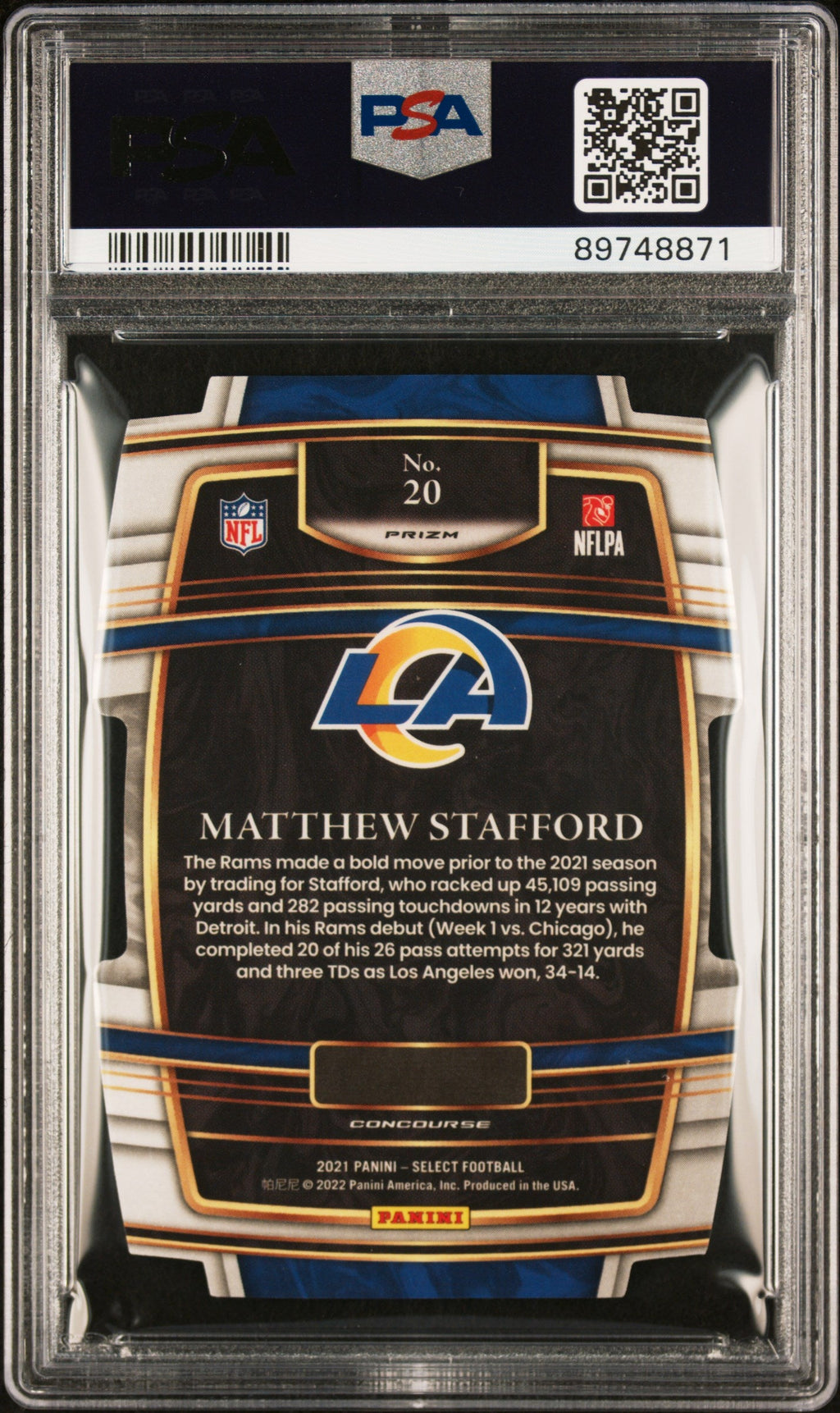 2021 Select Matthew Stafford Die Cut Zebra Prizm #20 PSA 9 Los Angeles Rams Add a rare gem to your football card collection with this stunning 2021 Panini Select Die Cut Zebra Prizm featuring Matthew Stafford of the Los Angeles Rams! Professionally graded PSA 9, this eye-catching card is one of only 7 in existence, with just 9 graded higher, making it a true standout for serious collectors and Rams fans alike. With its striking zebra pattern parallel and top-tier PSA authentication (certification #89748871), this card offers both investment potential and visual appeal. Don’t miss your chance to own this exclusive piece of NFL history—cards like this are highly sought after and rarely surface in such exceptional condition! Set: 2021 Panini Select Certification Number: 89748871 Grader: Professional Sports Authenticator (PSA) Year Manufactured: 2021 Grade: 9 Player/Athlete: Matthew Stafford Graded: Yes Sport: Football Population Higher: 9 Parallel/Variety: Die Cut Zebra Prizm Manufacturer: Panini Population: 7 Team: Los Angeles Rams Card Number: 20 Listed With Mascot.