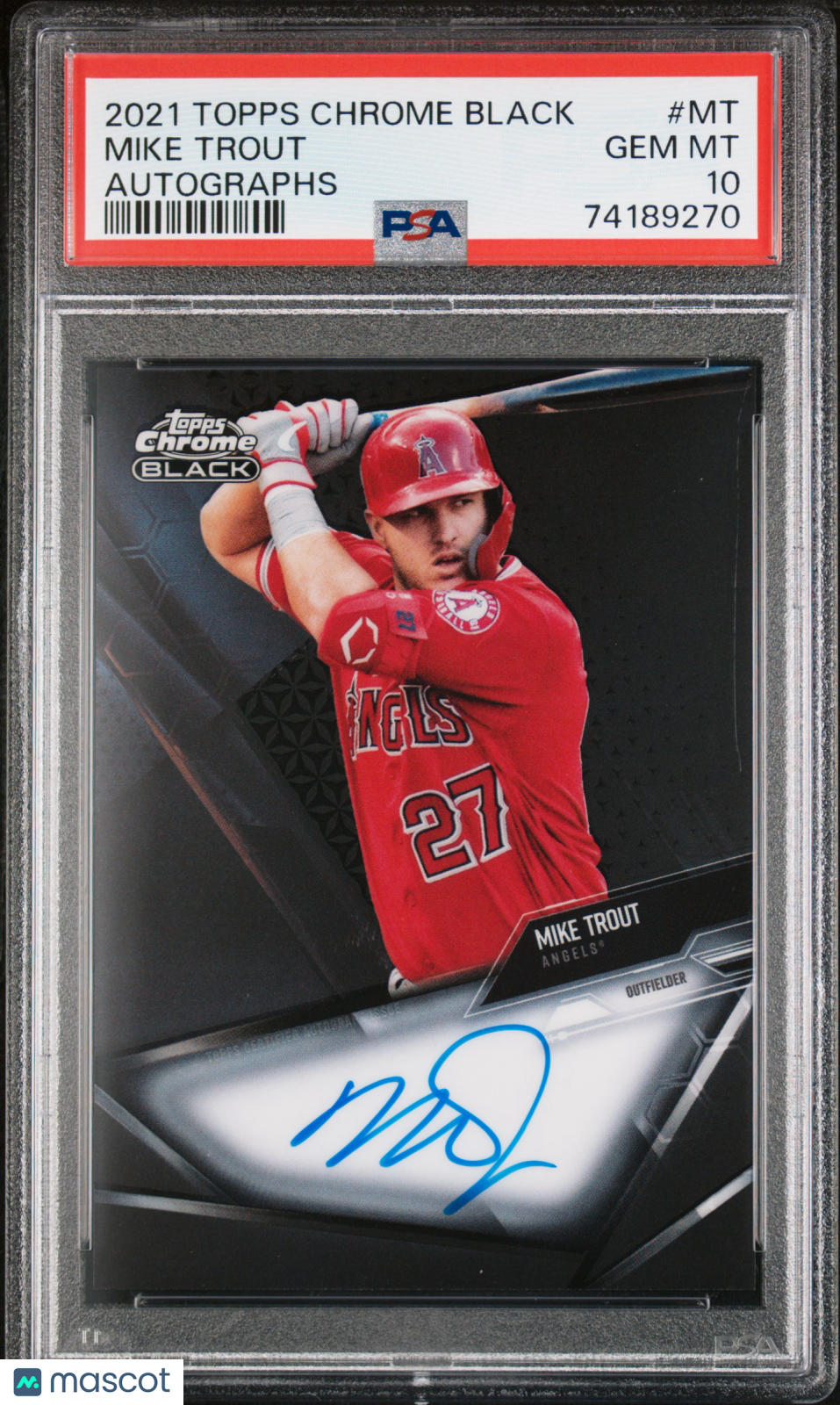 2021 Topps Chrome Black Autographs Mike Trout #MT PSA 10 Don’t miss your chance to own this stunning 2021 Topps Chrome Black Autographs Mike Trout #MT, graded PSA 10 and autographed by the superstar himself! This card is a must-have for any serious baseball or Mike Trout collector, featuring a perfect grade and authenticated signature with PSA certification. With a population of only 25 and none graded higher, this is a rare opportunity to add a true gem to your collection. This card comes from the highly sought-after Topps Chrome Black Autographs set and is officially certified by Professional Sports Authenticator (PSA), making it an investment-grade collectible. Secure this exceptional piece of baseball history today before it’s gone—Mike Trout autographs in this condition are in high demand! Autographed: Yes Set: 2021 Topps Chrome Black Autographs Signed By: Mike Trout Certification Number: 74189270 Grader: Professional Sports Authenticator (PSA) Player/Athlete: Mike Trout Year Manufactured: 2021 Grade: 10 Graded: Yes Sport: Baseball Population Higher: 0 Manufacturer: Topps Population: 25 Card Number: MT Listed With Mascot.