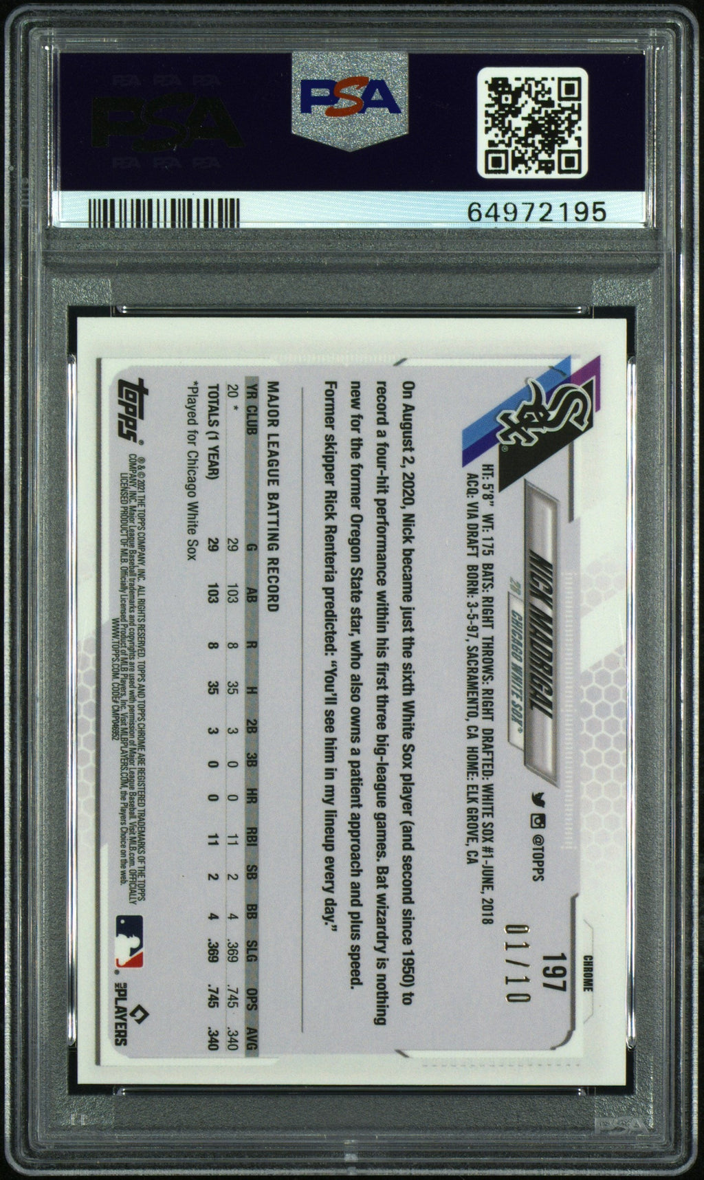 You are purchasing the following: 2021 Topps Chrome Sapphire Nick Madrigal Purple #197 PSA 9 . You will receive the exact item in the photographs. Note: Please do not connact us and asking the following: 1. What is the lowest you would take? Just make an offer. If the offer is automatically declined, you have your answer. 2. What the best you can do? See above. Not repling to an email is a reply. 3. Any room on this? See above. Not repling to an offer is a reply. 4. We ONLY do one counter offer, so please make your best offer the first time! Note: If the price off, in your option, please send your resaoning and an offer. We will review it. Note: We manage nearly 10 millon cards regularly and will adjust prices as errors are noticed or pointed out! Listed With Mascot.