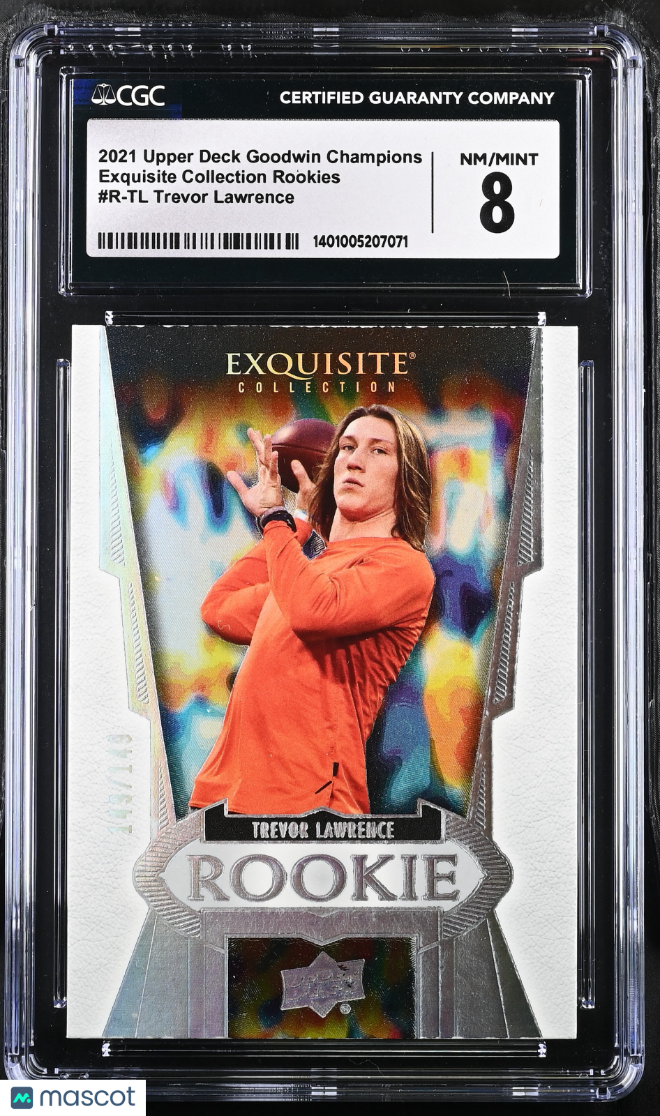 2021 Upper Deck Goodwin Champions 149/149 Exquisite Collection Rookies #R-TL CGC 8 Don’t miss your chance to own a truly rare collectible! This 2021 Upper Deck Goodwin Champions Exquisite Collection Rookies card, serial numbered 149/149, is certified by CGC with a solid grade of 8. As the only known population of its kind, this card stands out as a must-have for serious collectors and Upper Deck enthusiasts. The R-TL card celebrates the Exquisite Collection Rookies line, a highlight of the 2021 release, and is the perfect addition for anyone looking to invest in exclusive modern trading cards. 🌟 Professionally graded and authenticated by Certified Guaranty Company, this card features the sought-after Exquisite Collection Rookies insert, making it a centerpiece for any collection. With its unique 149/149 serial number and pristine presentation, this collectible is ideal for display or long-term investment. Secure this one-of-a-kind card today before it’s gone! 🏆 Graded: Yes Set: 2021 Upper Deck Goodwin Champions Certification Number: 1401005207071 Grader: Certified Guaranty Company (CGC) Manufacturer: Upper Deck Population: 1 Features: Exquisite Collection Rookies Year Manufactured: 2021 Grade: 8 Card Number: R-TL Franchise: N/A Serial Number: 149/149 Listed With Mascot.
